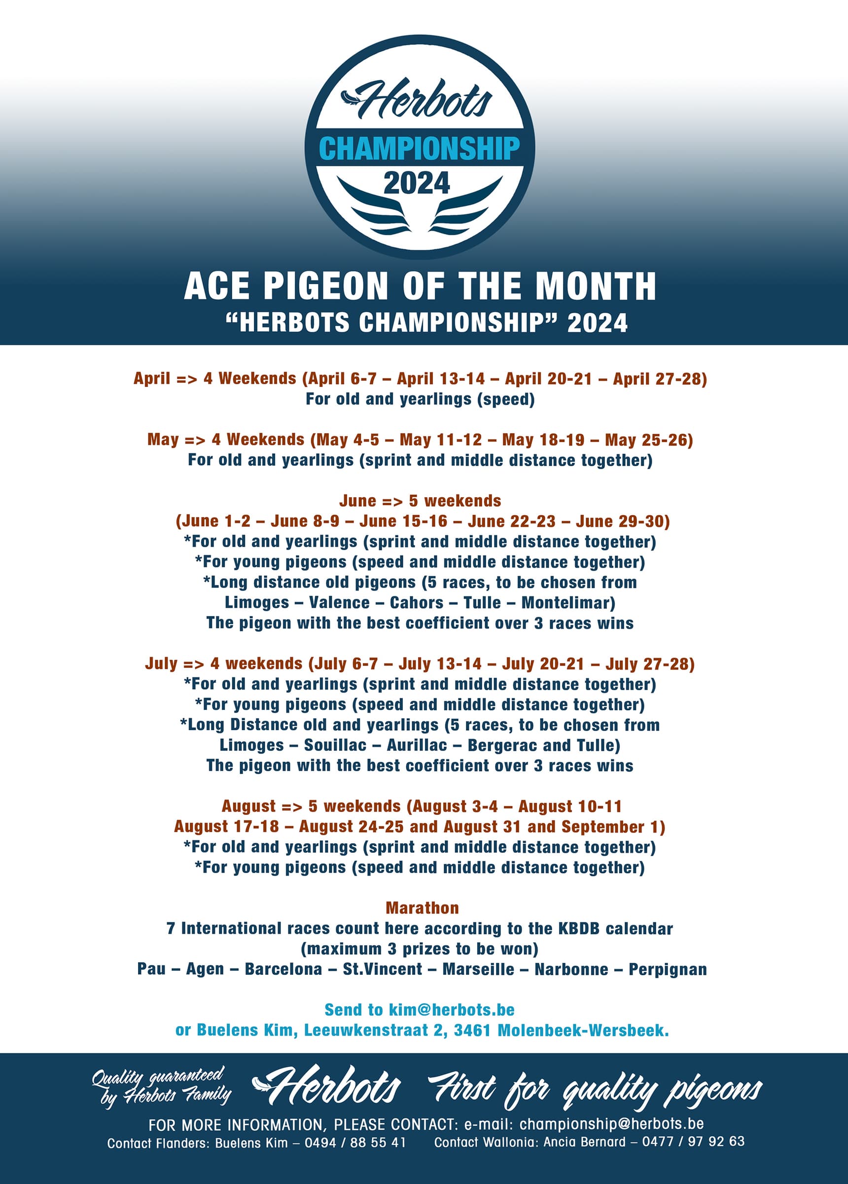 The winners of the month are invited free of charge to our champion celebration of the Herbots Championship and will receive a report of their ace pigeon together with the first 3 laureates on our website www.herbots.be