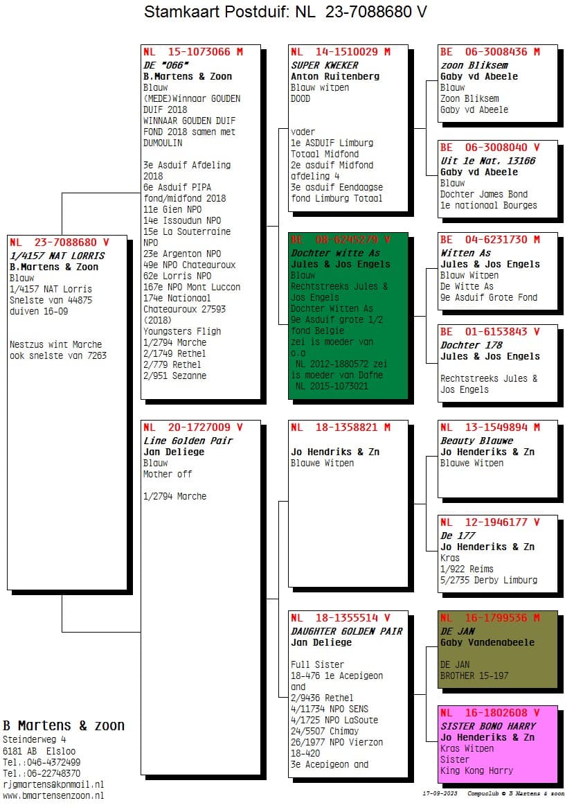 Son of “NL 029/14” Grandson Bliksem Vandenabeele x “BE 279/08” Daughter Witte As Jos & Jules Engels is grandmother of “Mathieu” and so many others