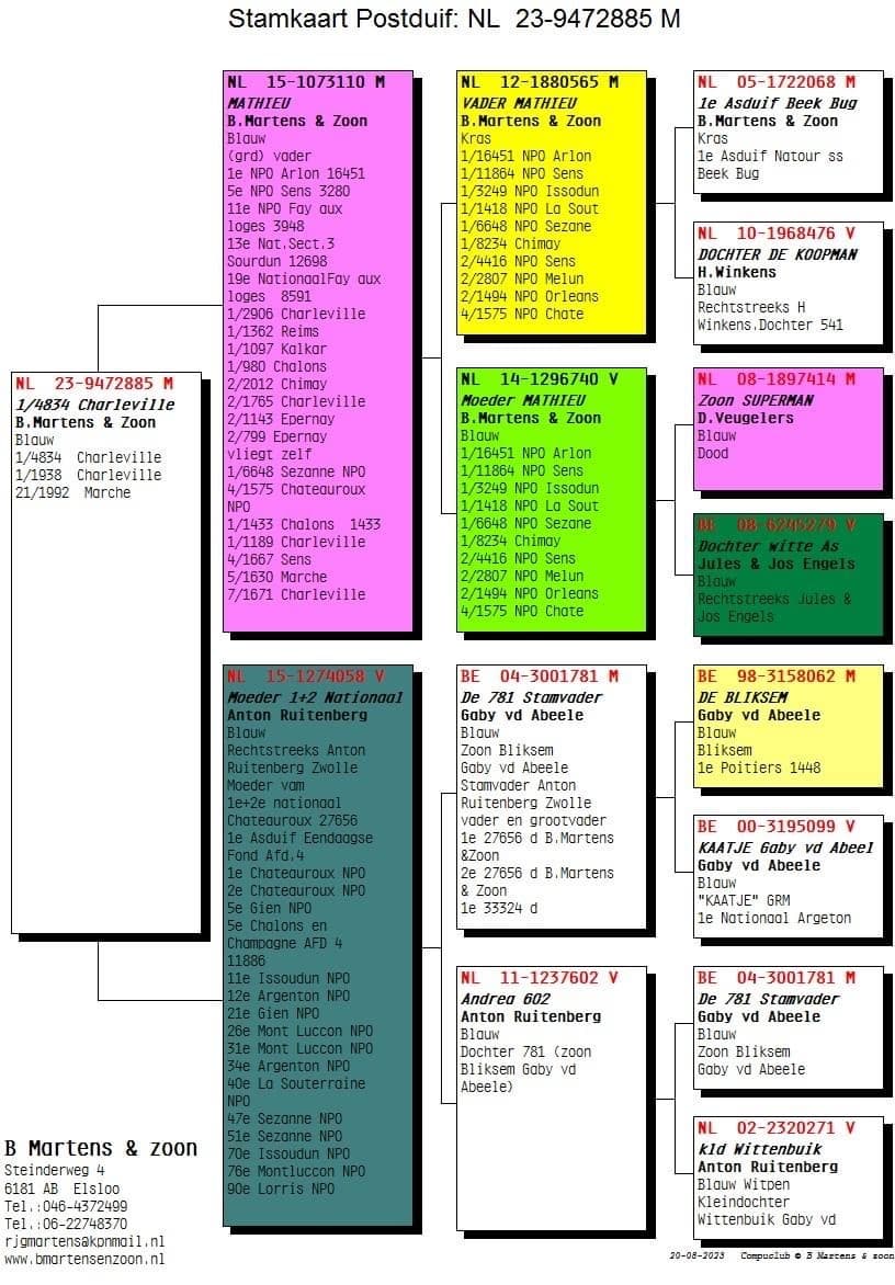 Son of “NL 068/05” Checkered won 1st Sezanne 994p – 6 Reims 1,711p – 15 Reims 2,202p – 18 Marche 2,377p – 21 Sezanne 2,346p x “NL 476/10” Daughter Koopman Cock x H.Winkens