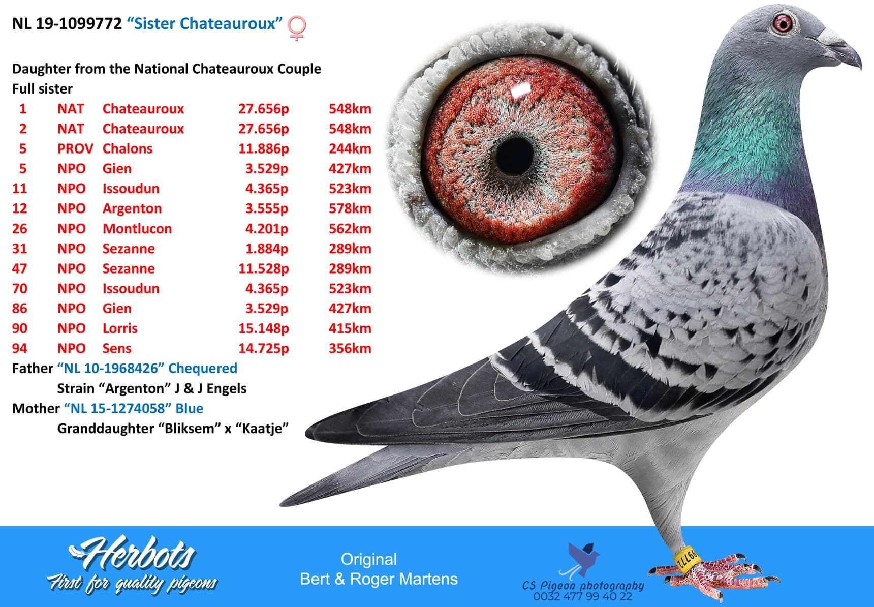 On the national holiday from Belgium, Holland had its National race Chateauroux. From Chateauroux to the lofts of Bert & Roger Martens it is exactly 548km. When you win here the 1st and 2nd against 27,656 pigeons nationally with 2 cocks out of the same nest you can truly speak of a stunt.