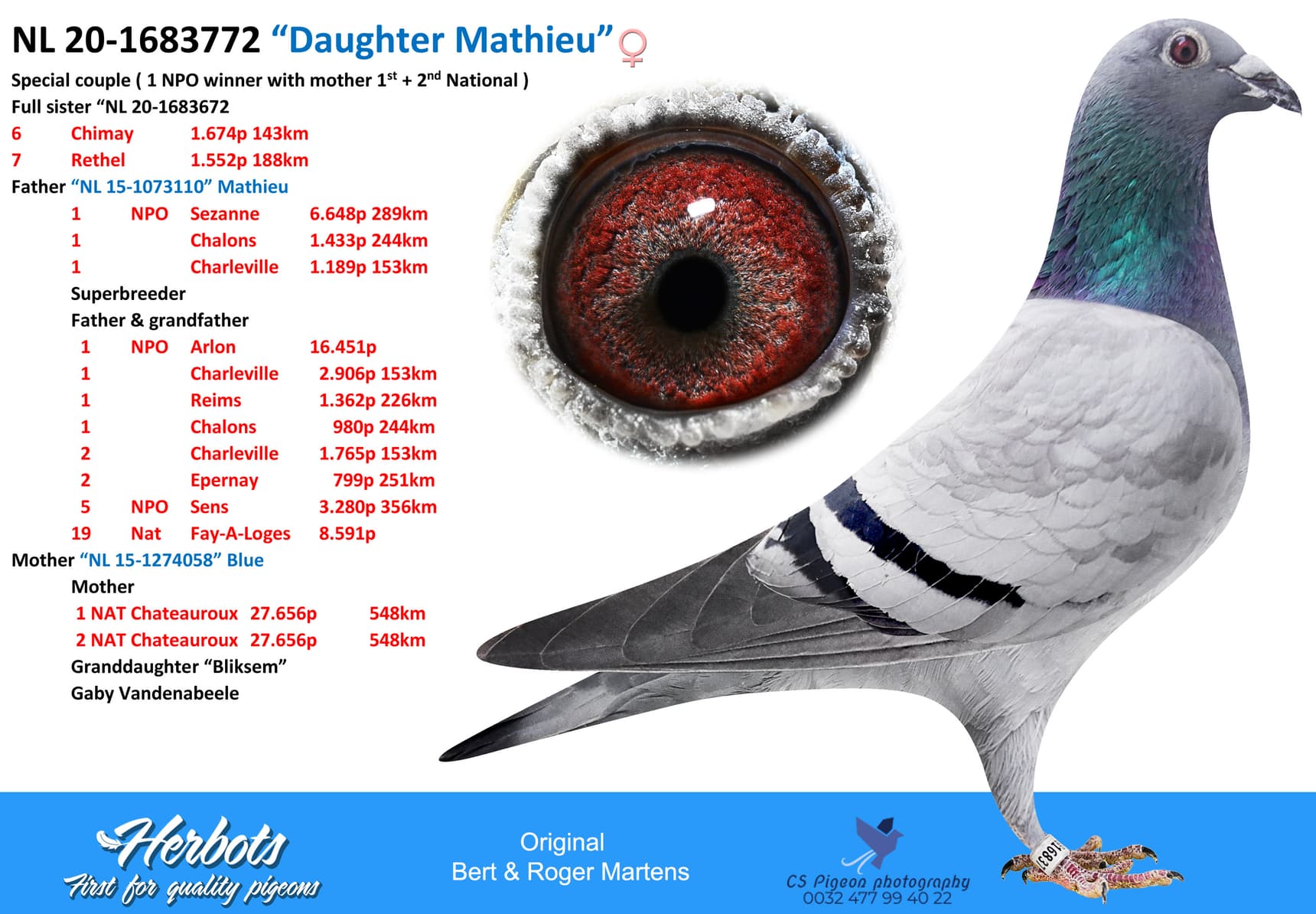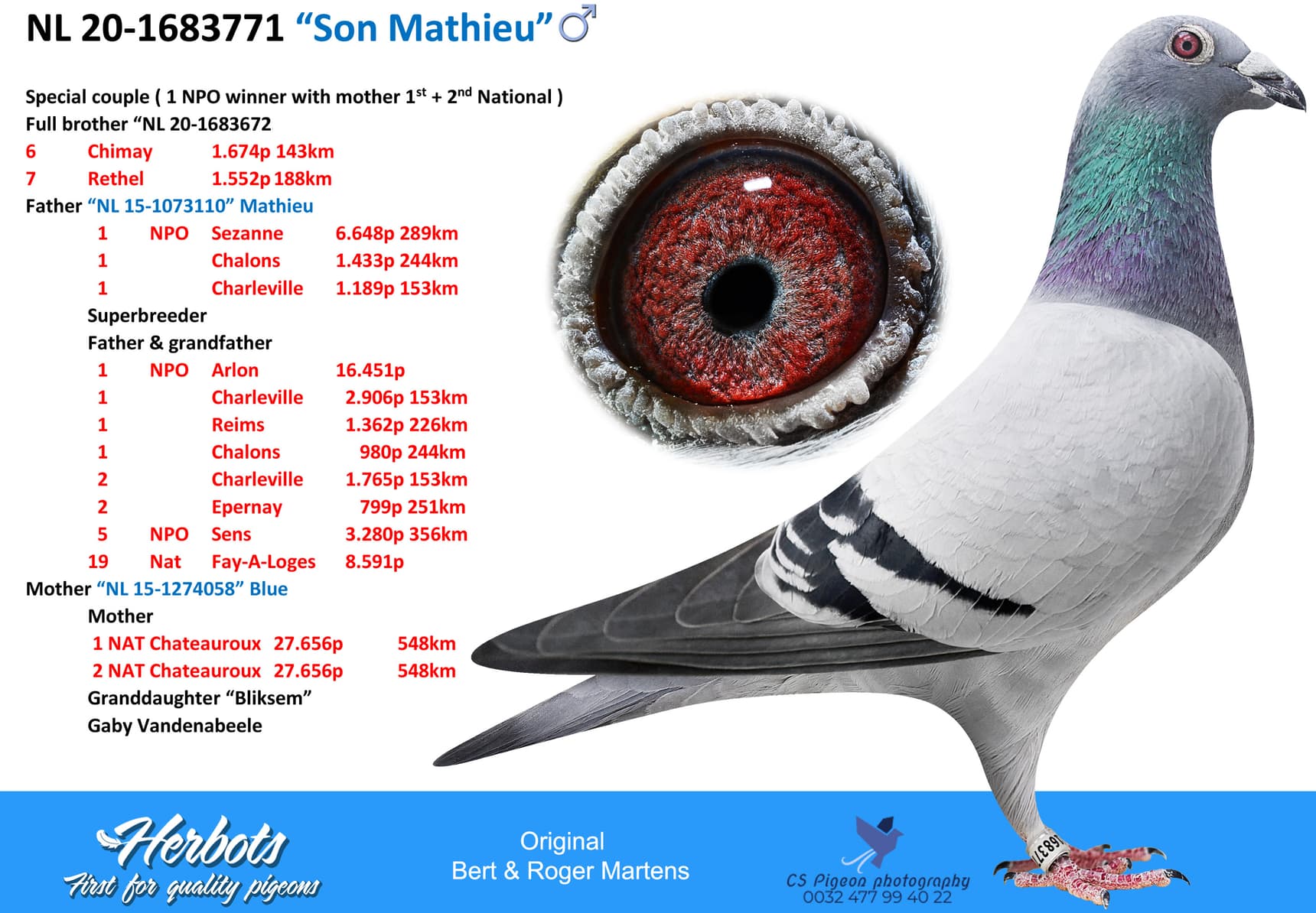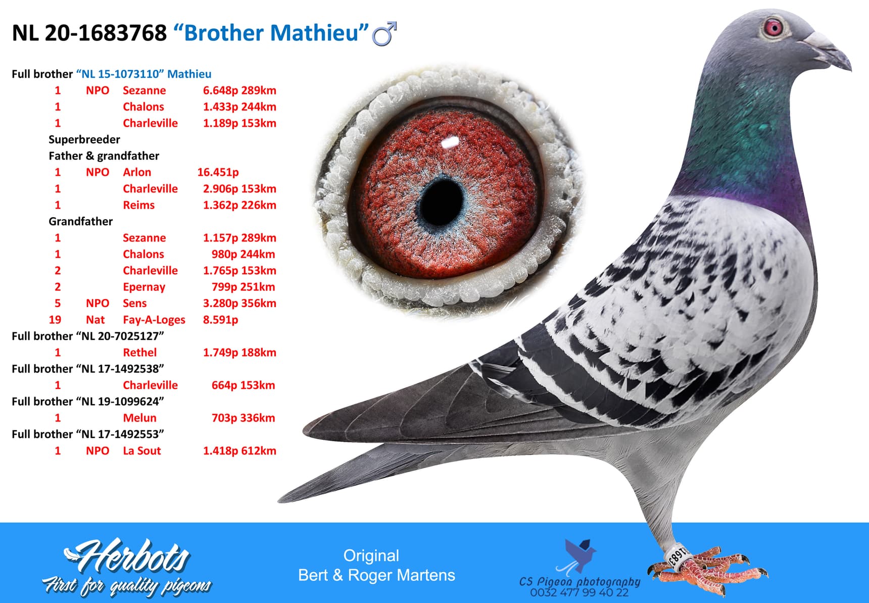 NL 15-1073110 Mathieu was a super racer himself and won 1 NPO Sezanne 6,648b , 1 Chalons 1,433b and 1 Charleville 1,189b.