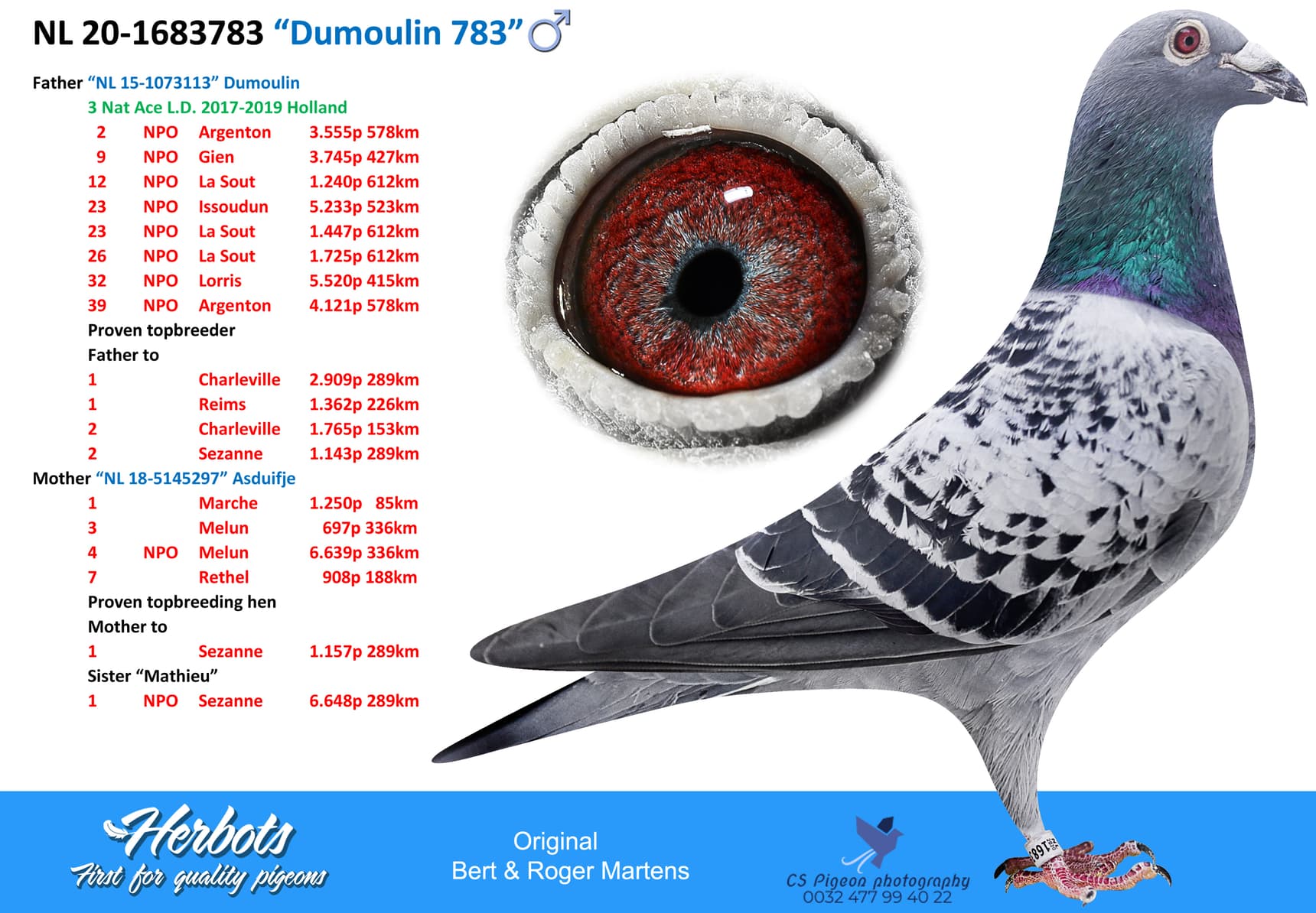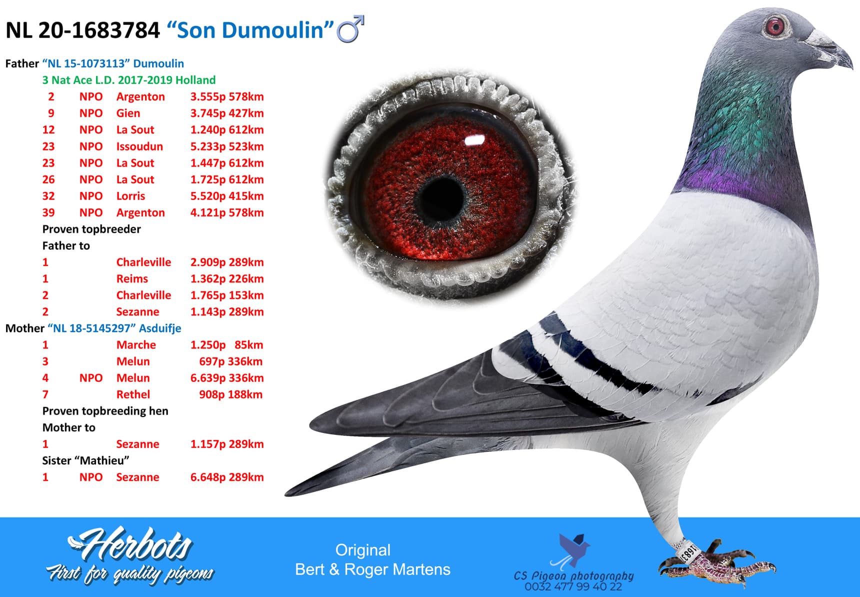 NL 15-1073113 “Dumoulin” was the youngest topper and became the 3rd National Ace bird over 3 years Holland on the middle distance races. He won in total 8 x TOP 40 NPO and 15 x per 100-tal in his career. He is a true wonder racer where you can count on and now already gave 3 winners against more than 1,000 pigeons on the breeding loft.
