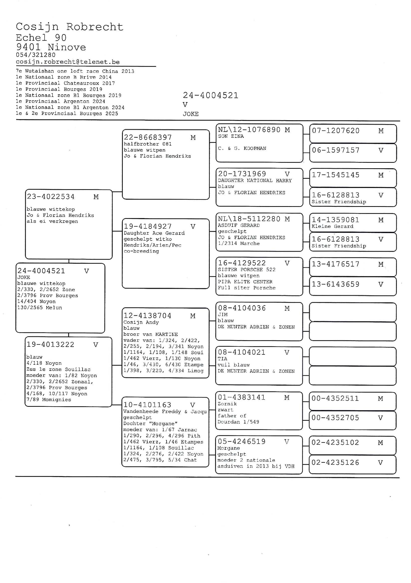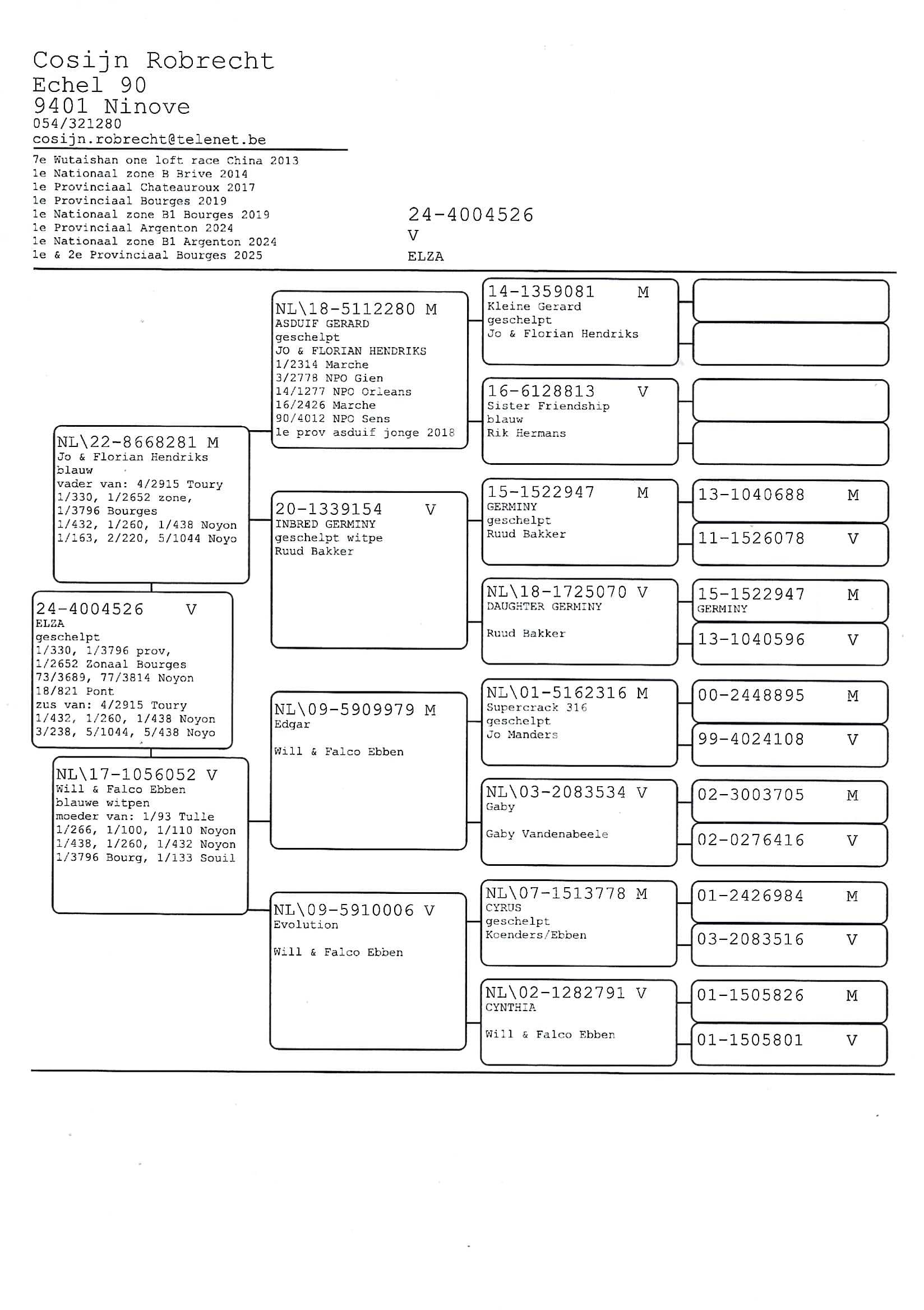 cosijn robrecht - pollare 1st and 2nd provincial bourges 3,796 yearling birds 1st and 2nd nat (z) bourges 2,652 yearlings