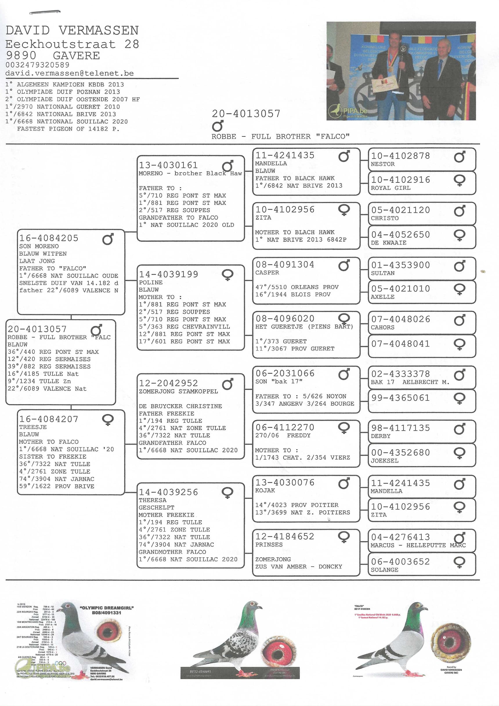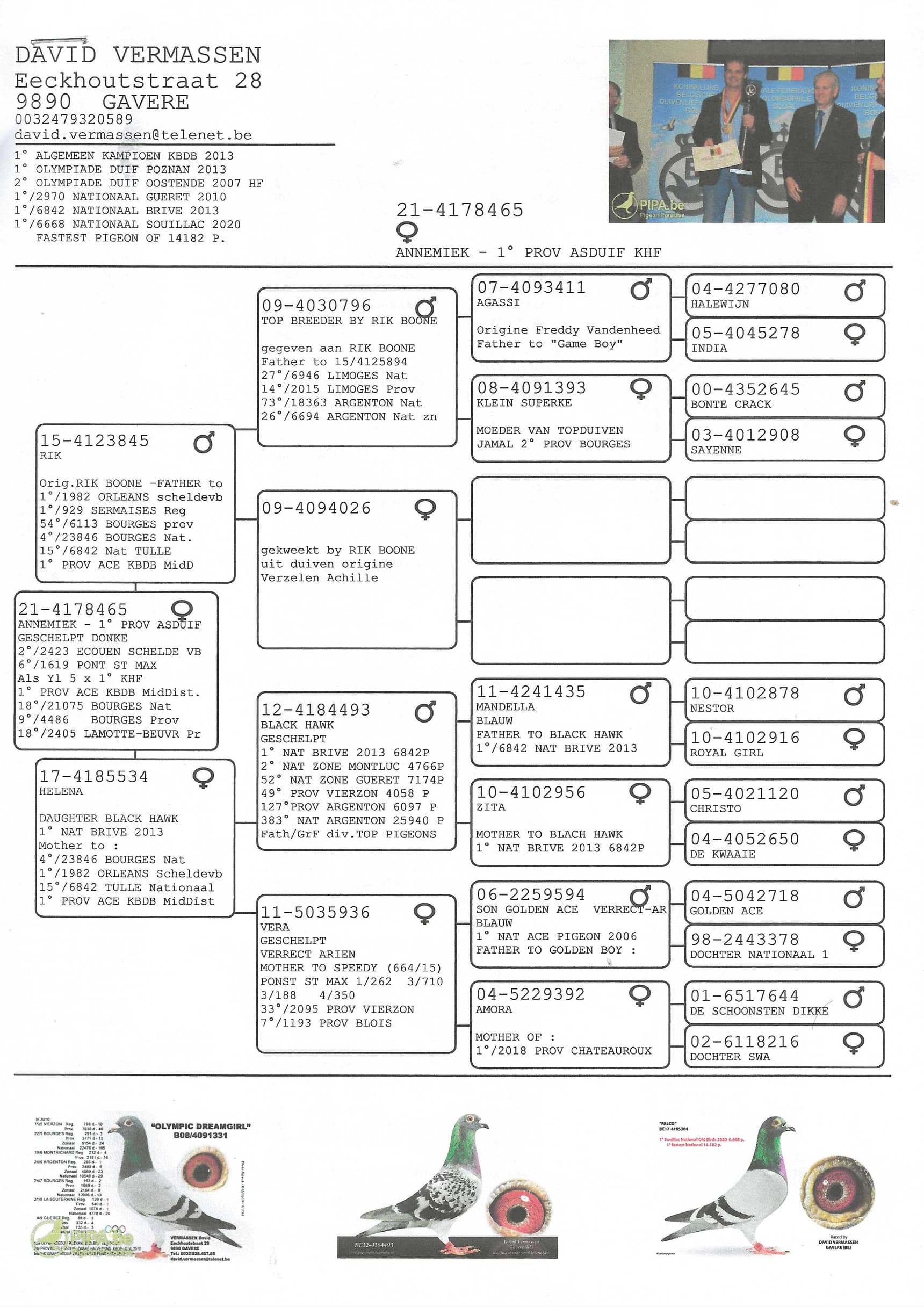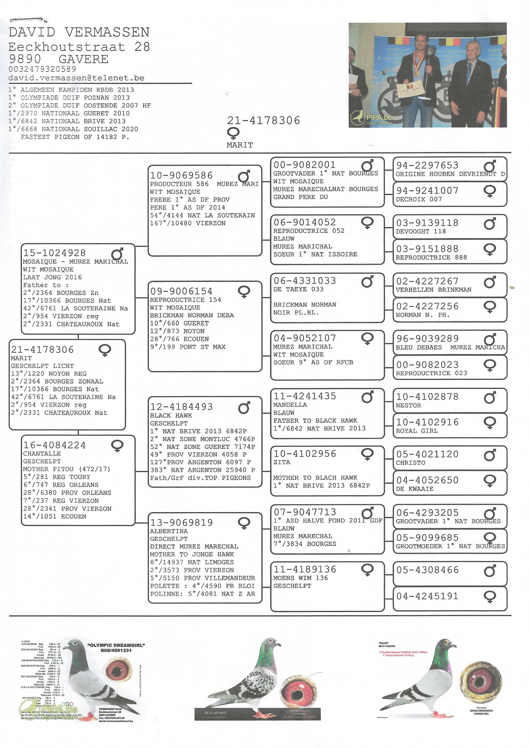 Daughter of “Black Hawk” 1 Nat Brive 6,842 pigeons in 2013 x “Vera” Verreckt – Ariën