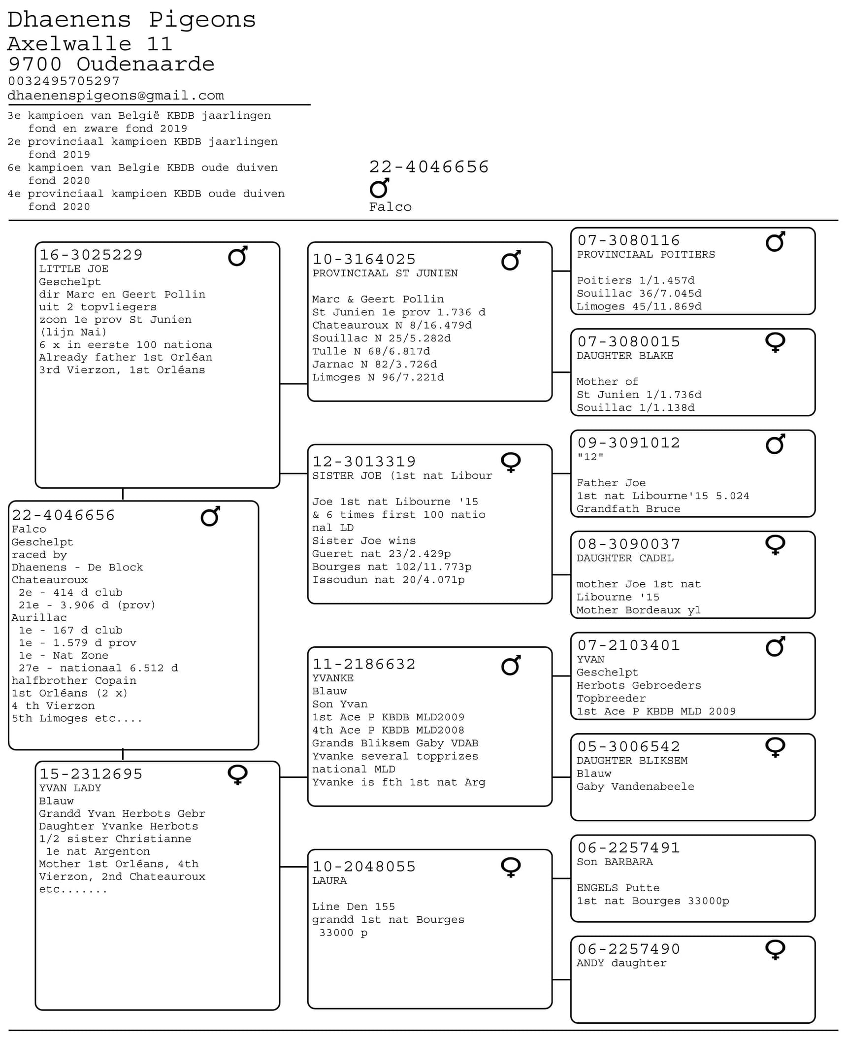 Falco has noble blood in his veins. His father is Little Joe and comes directly from the lofts of Marc & Geert Pollin. Little Joe is a son of top ace Saint Junien who flew top 100 national 5 times on the Pollin lofts and the line of Little Joe, winner 1st nat Libourne and top breeder.