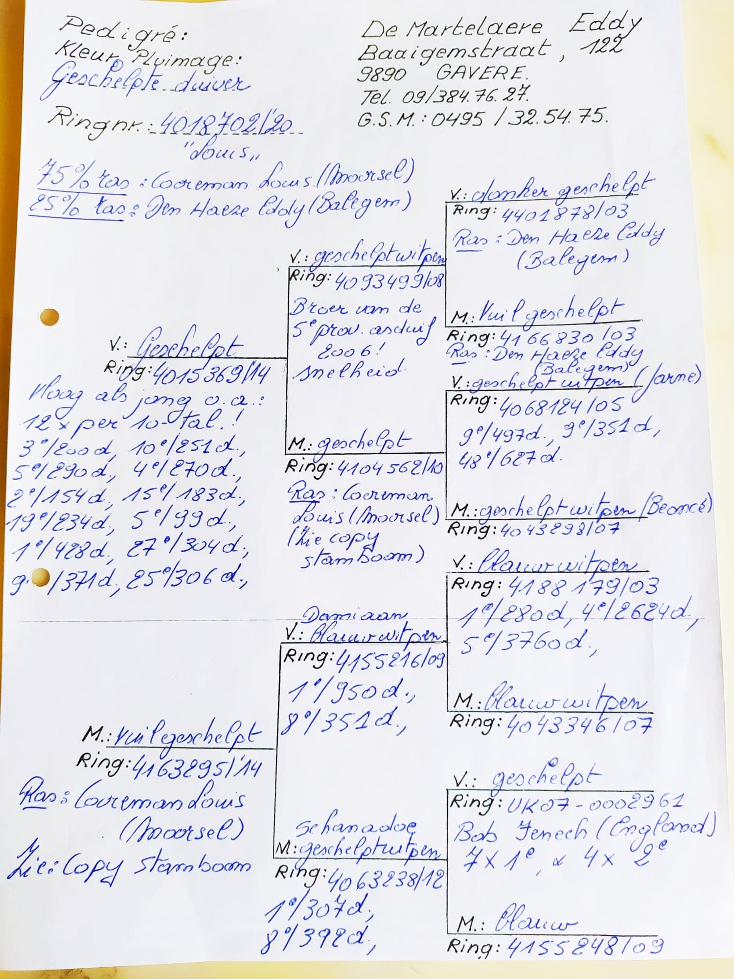 When you achieve strong results, you come into the sights of other strong players...and so the late Louis Cooreman contacted Eddy to exchange pigeons. Both improved and this exchange exercise was repeated several times. Also from burentandem Van De Voorde - Verlinden from Baaigem (1st national Bourges youngsters 2006) came really good ones.