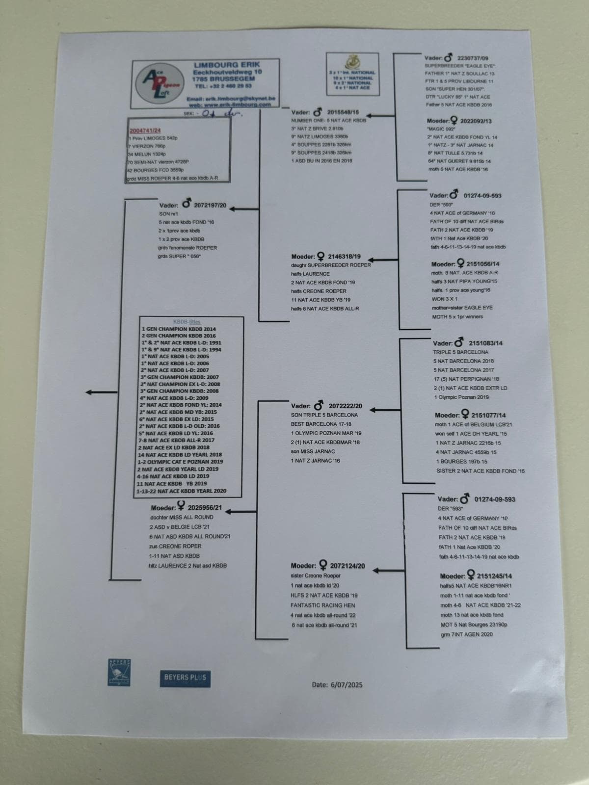 Daughter of "222/20" Son Triple 5, who won 2 x 5th National Barcelona and 2nd National Ace Pigeon Extreme Long Distance KBDB x "124/20" Miss All Round, winner of 4th and 6th National Ace Pigeon All Round KBDB. 2021+2022 and full sister of “Creone Roeper” and “Laurence”