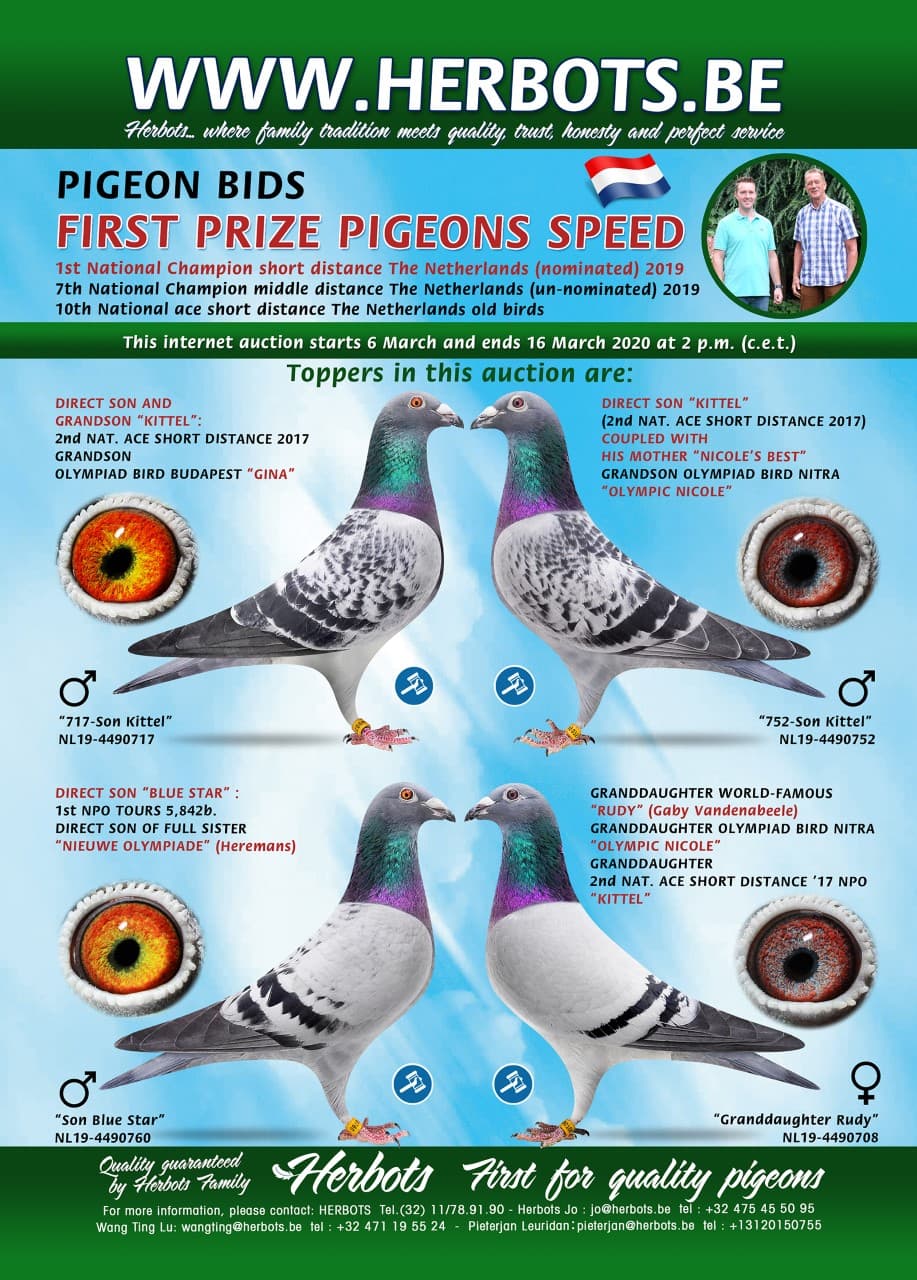 first prize pigeons speed 1st national champion short distance the netherlands (nominated) 2019 7th national champion middle distance the netherlands (un-nominated) 2019 10th national ace short distance the netherlands old birds