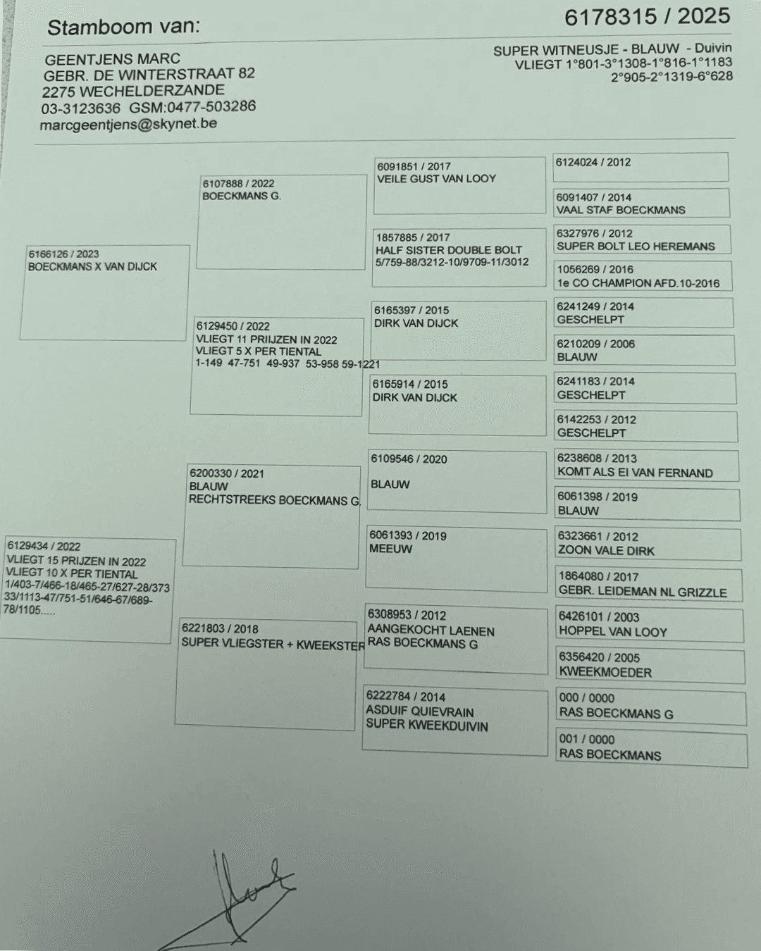 The 2025 season is proving to be an absolute highlight for Geentjens - Van Tricht. At the heart of their success shines BE25-6178315 “Super Witneusje”, a blue hen that has quickly grown into the flagship of the loft. Week after week she demonstrates her class, consistency, and finishing power against strong competition.