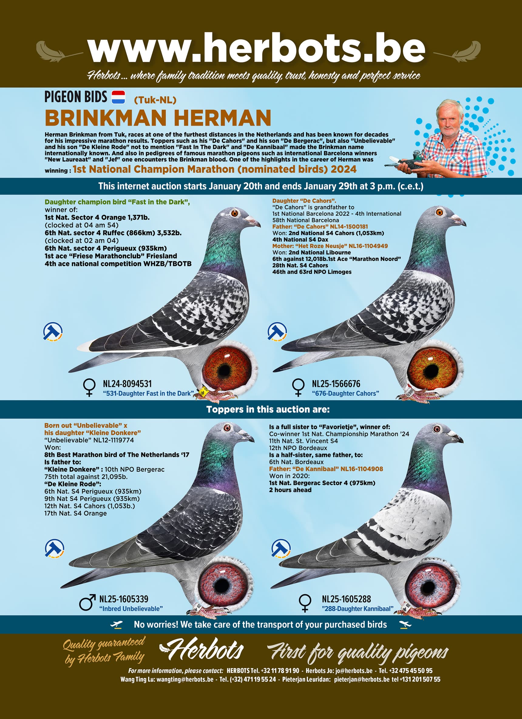 In Dutch pigeon racing, the name Herman Brinkman is synonymous with strong performance in marathon races. From his home town of Tuk, located in Overijssel, he has developed into one of the most respected fanciers within the heavy long distance races. The immense distances of flights such as Barcelona (1,308 km), St. Vincent (1,153 km), Cahors (1,053 km), Agen (1,053 km) and Perigueux (935 km) require pigeons with iron perseverance. The Brinkman pigeons prove time and again that they can handle these flights.