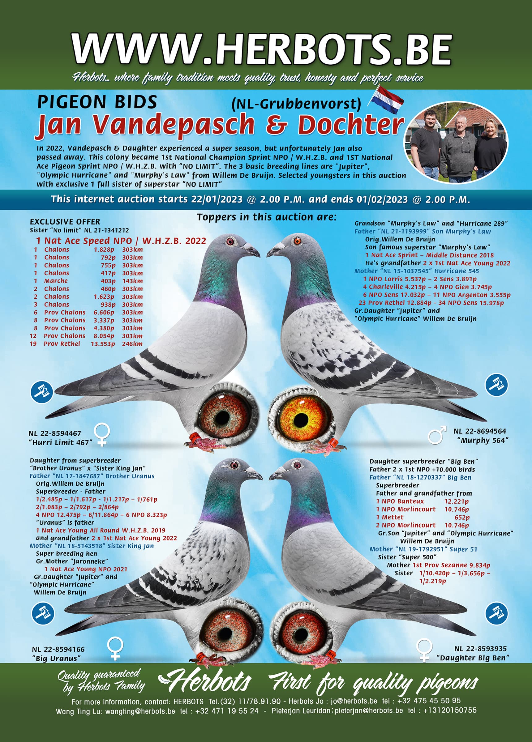 That is why they are auctioning some top grandchildren of "Murphy's Law". In 2022, this super breeder was the grandfather of 2 x 1st National Ace Pigeon youngsters by Willem himself.