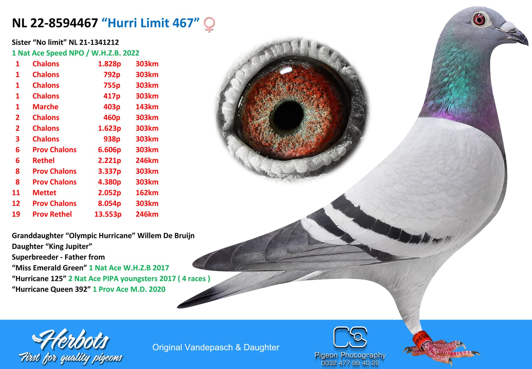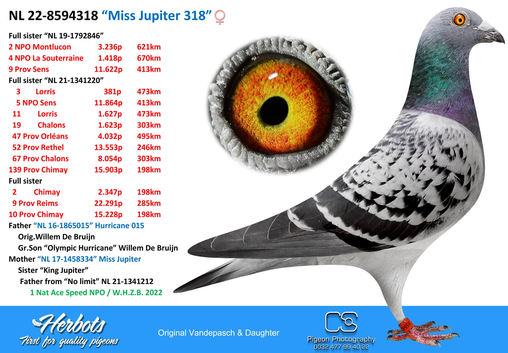 “Jupiter” itself is a crossing of Willem De Bruijn x Dochter Lowieke as we mentioned above.In the new top pigeons of the 2022 season, "NO LIMIT" is again a granddaughter of this classy pigeon "Jupiter". “Jupiter” x Willem De Bruijn simply hits the bull's eye.