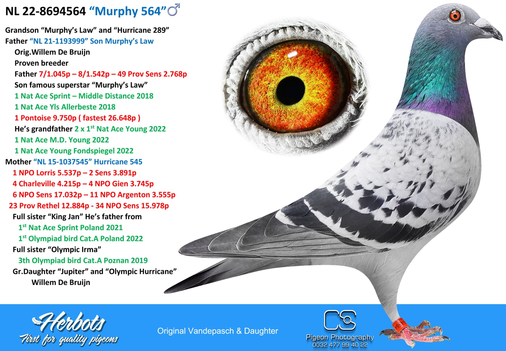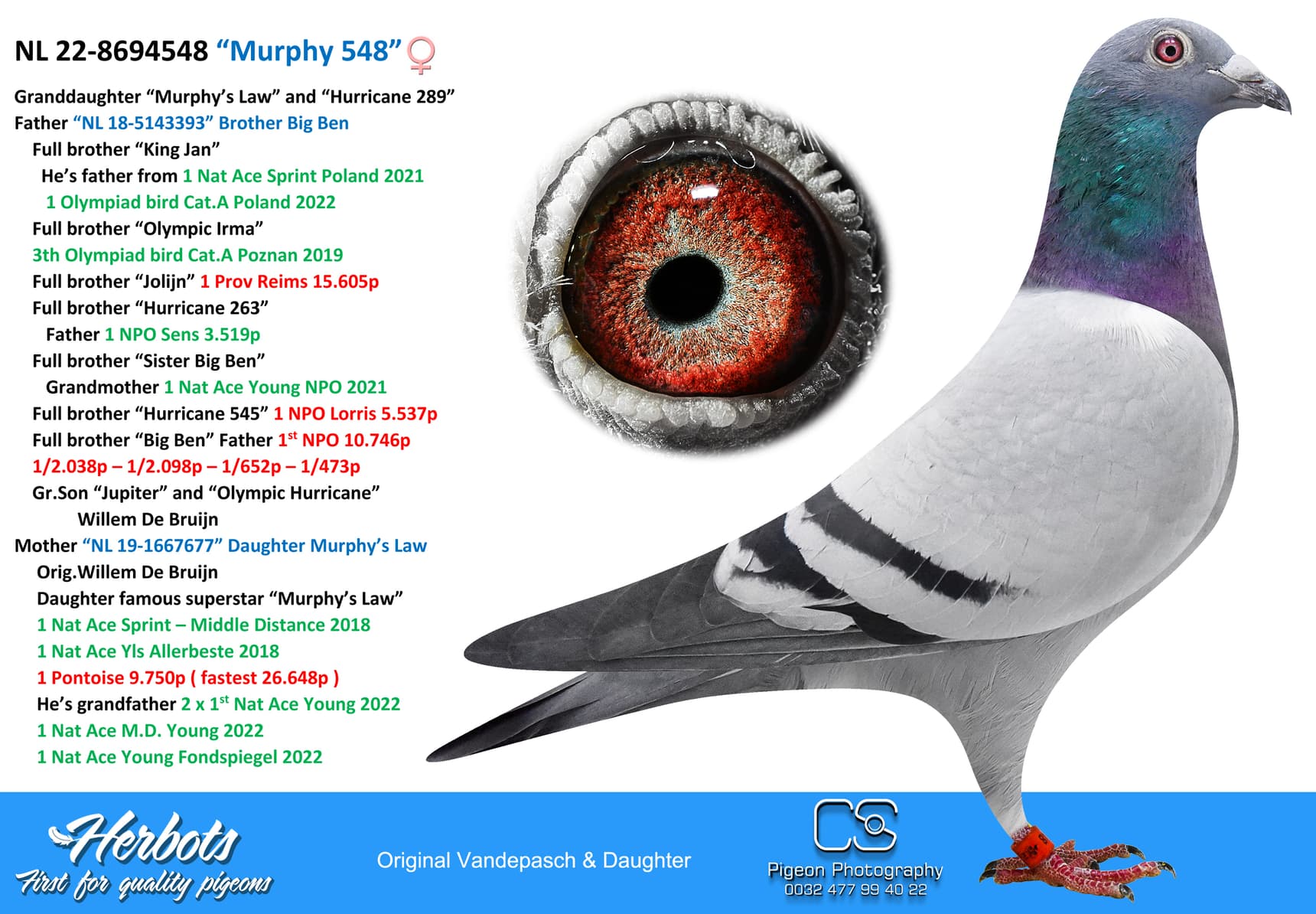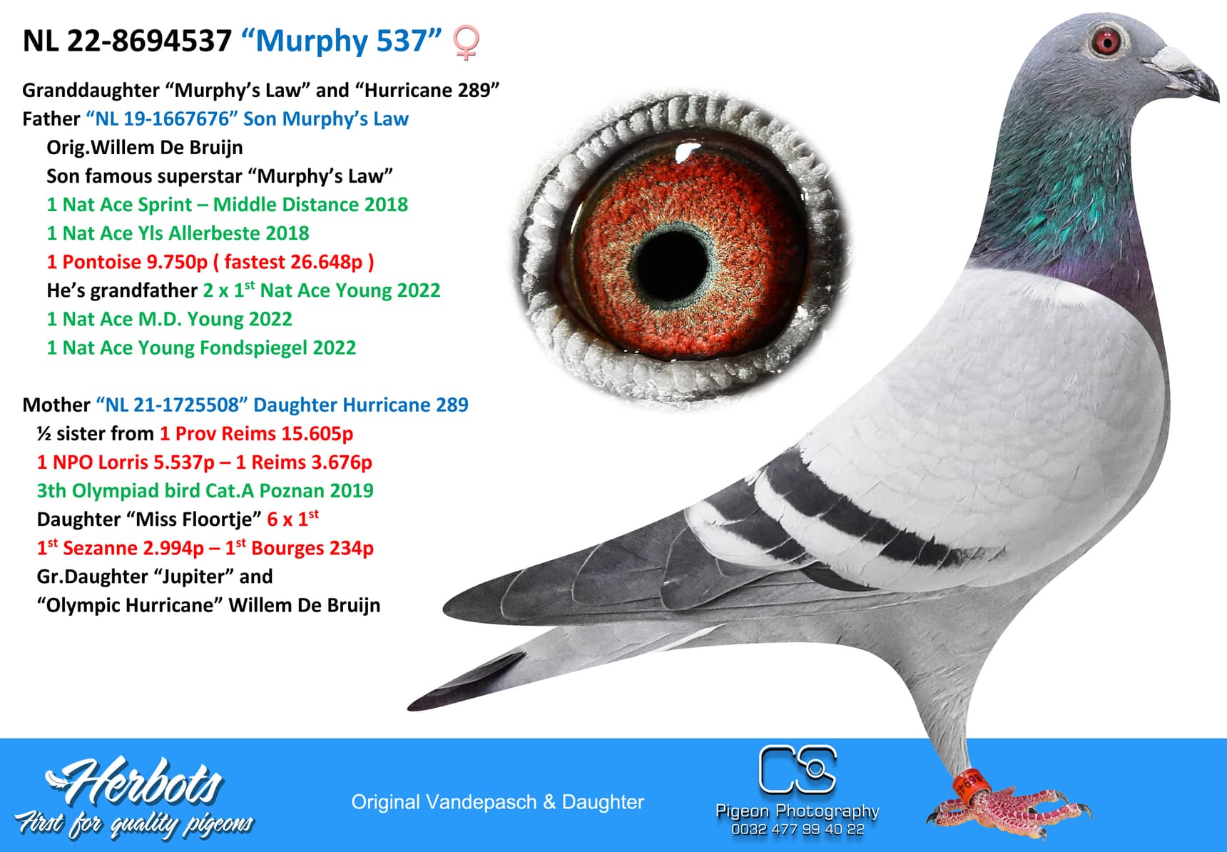 Has been bred from a son of "Murphy's Law" coupled to super hen "Hurricane 545" who herself won 1st NPO Lorris against 5,537 pigeons and raced 4 x TOP 12 NPO in her career. She is a granddaughter of "Jupiter" and "Olympic Hurricane"