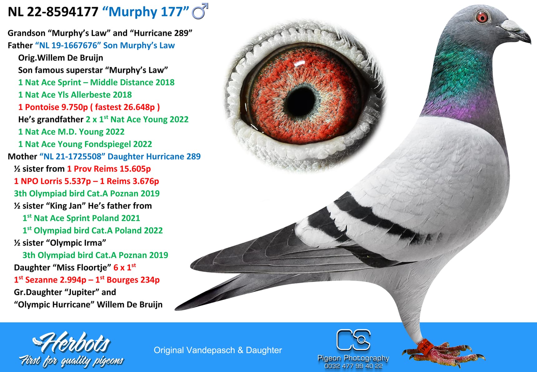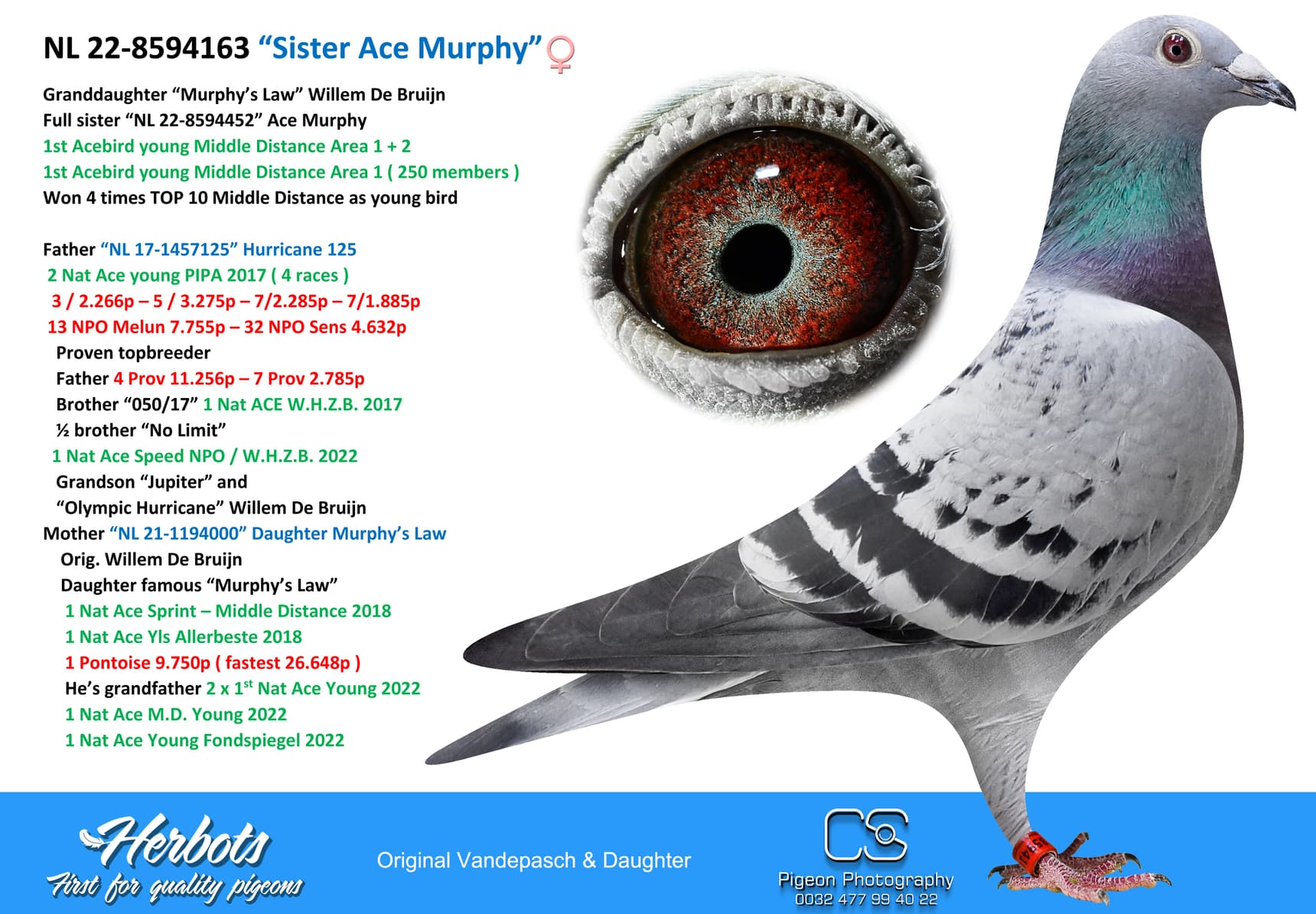 That is why they are auctioning some top grandchildren of "Murphy's Law". In 2022, this super breeder was the grandfather of 2 x 1st National Ace Pigeon youngsters by Willem himself.