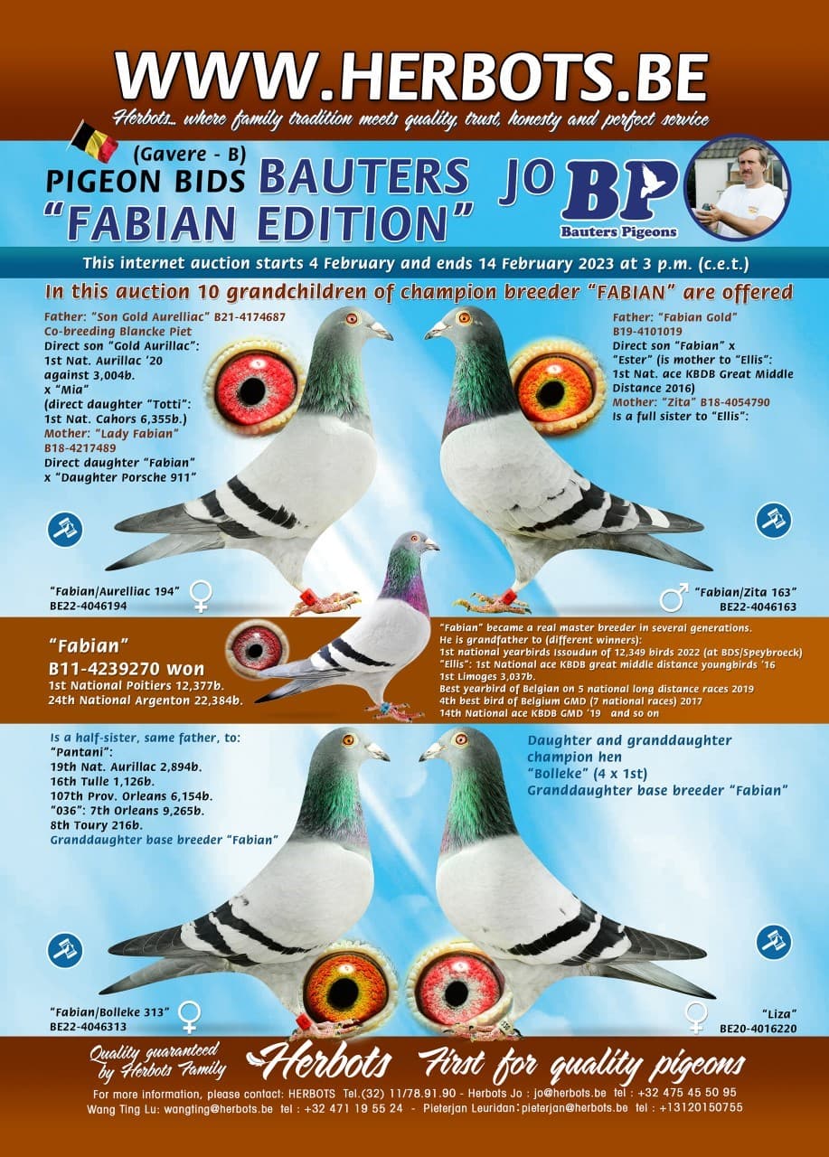 As you know, Jo Bauters had a very successful total sale in 2020 on the Herbots website and now Jo has taken a new start with the offspring of "Fabian" and concentrates mainly on the long distance races. But also the breeding lines of the other Bauters top birds are doing very well and we are talking about:
