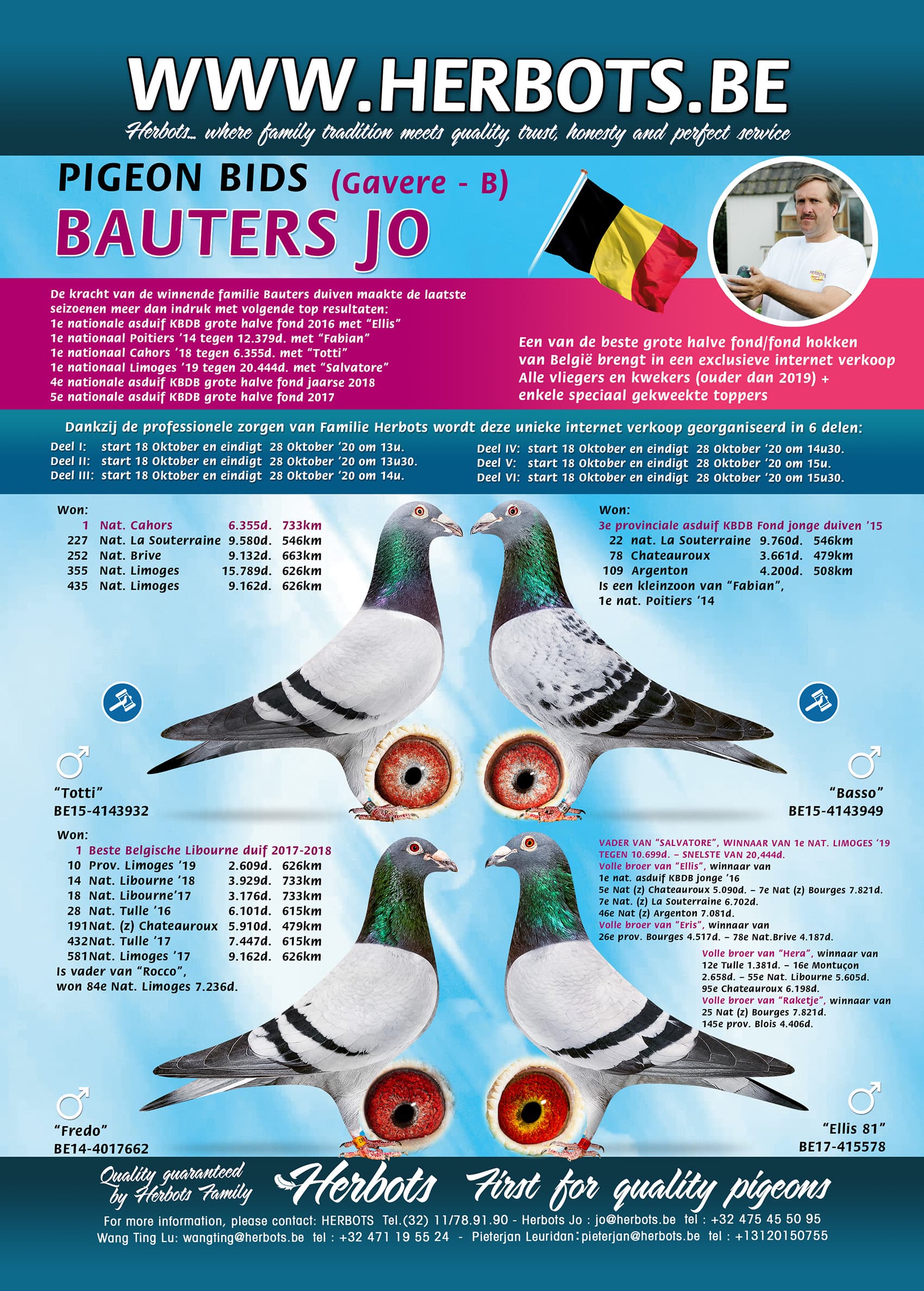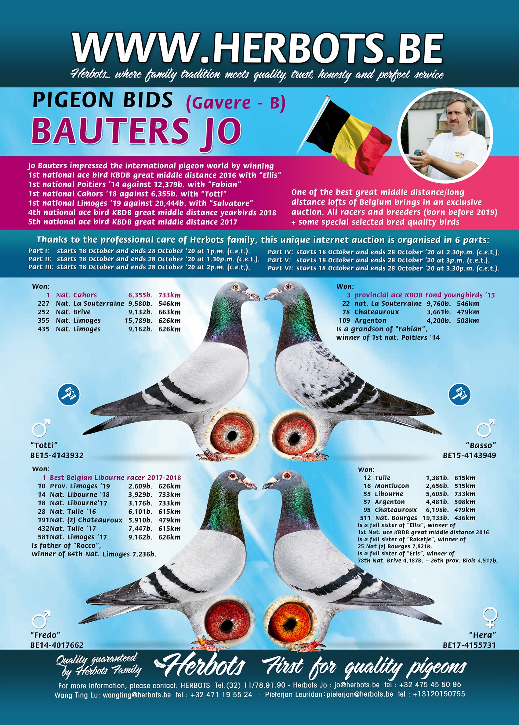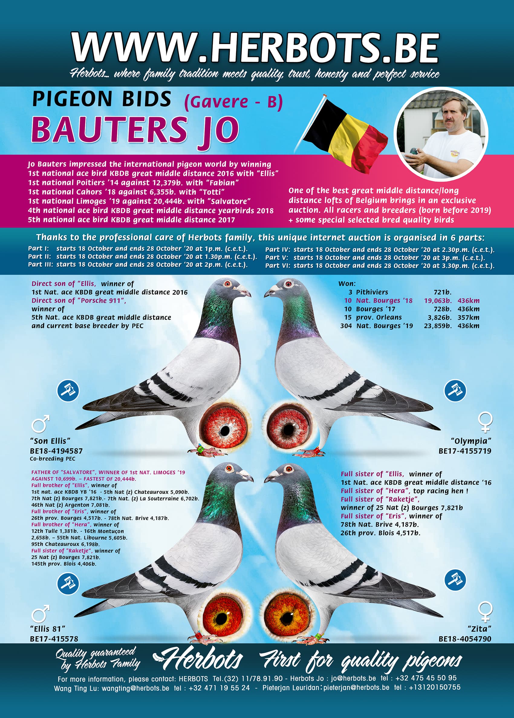 Gavere: Aren’t we all looking for that? Pigeons that don’t know the word ‘giving up’. Pigeons who know exactly what is being expected on races from 300km to 800km in a perfect way. Pigeons where ‘racing head’ is just woven into their DNA…well, if we have a good look at the pedigrees of the Bauters pigeons we have to admit that Jo and his wife Mieke have the art of building such a strong strain in their fingers. They know exactly what they are doing !