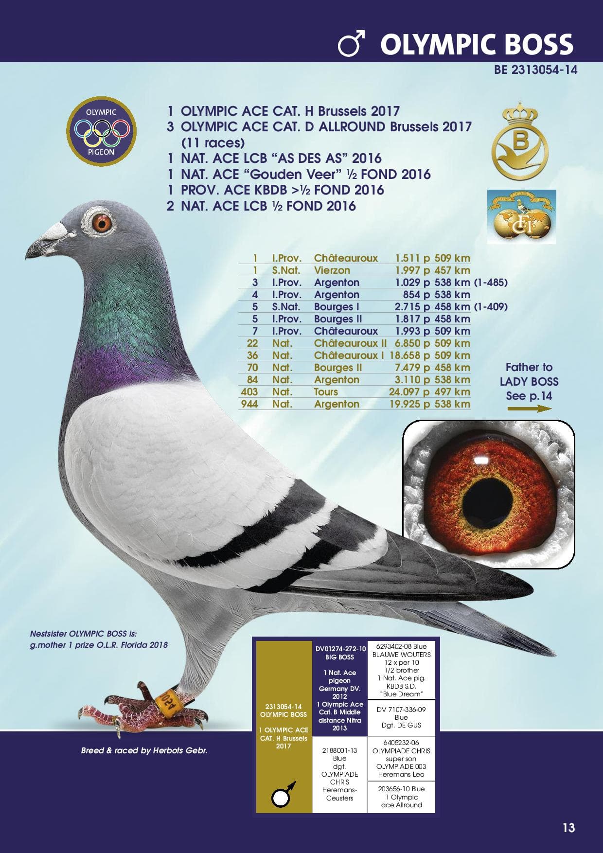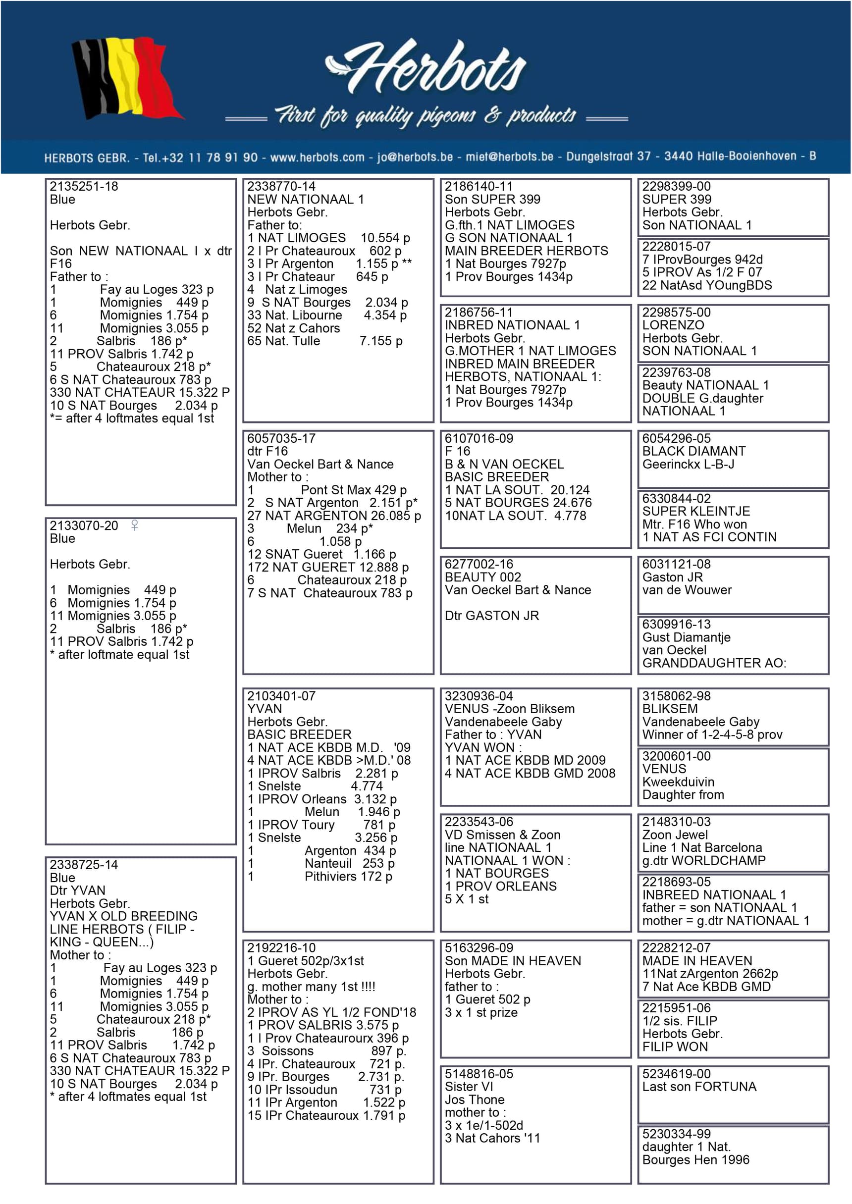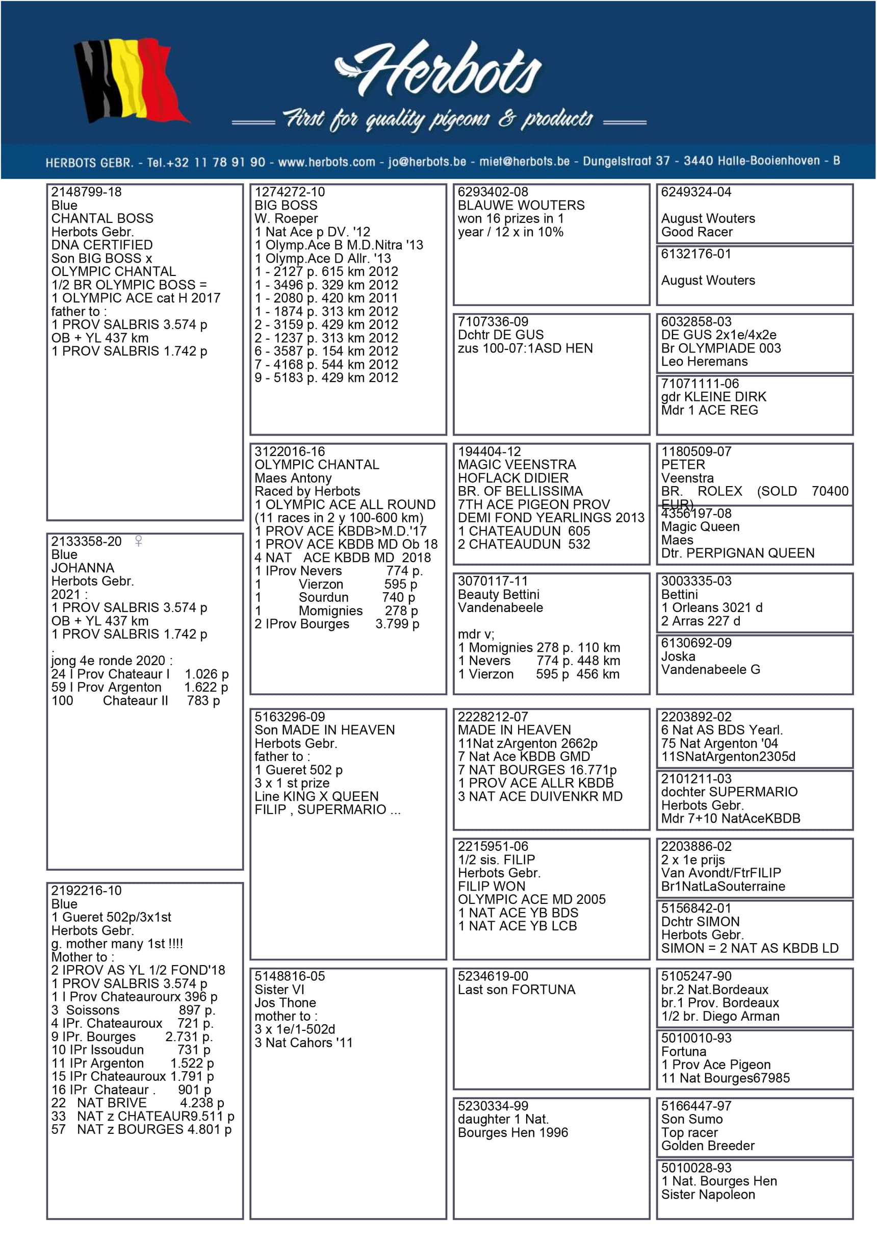 At around 11:35 am the 3,574 pigeons from Salbris were released and at around 3:45 pm the first pigeons were timed and the arrivals were fantastic. The first pigeon was BE 20-2133358, a blue hen who is also a granddaughter of superstar “Big Boss” and “Olympic Chantal”. This hen not only won 1st prize locally, but is also the fastest of all 1742 yearlings and the fastest of the 3574 pigeons that had been released a few hours earlier.