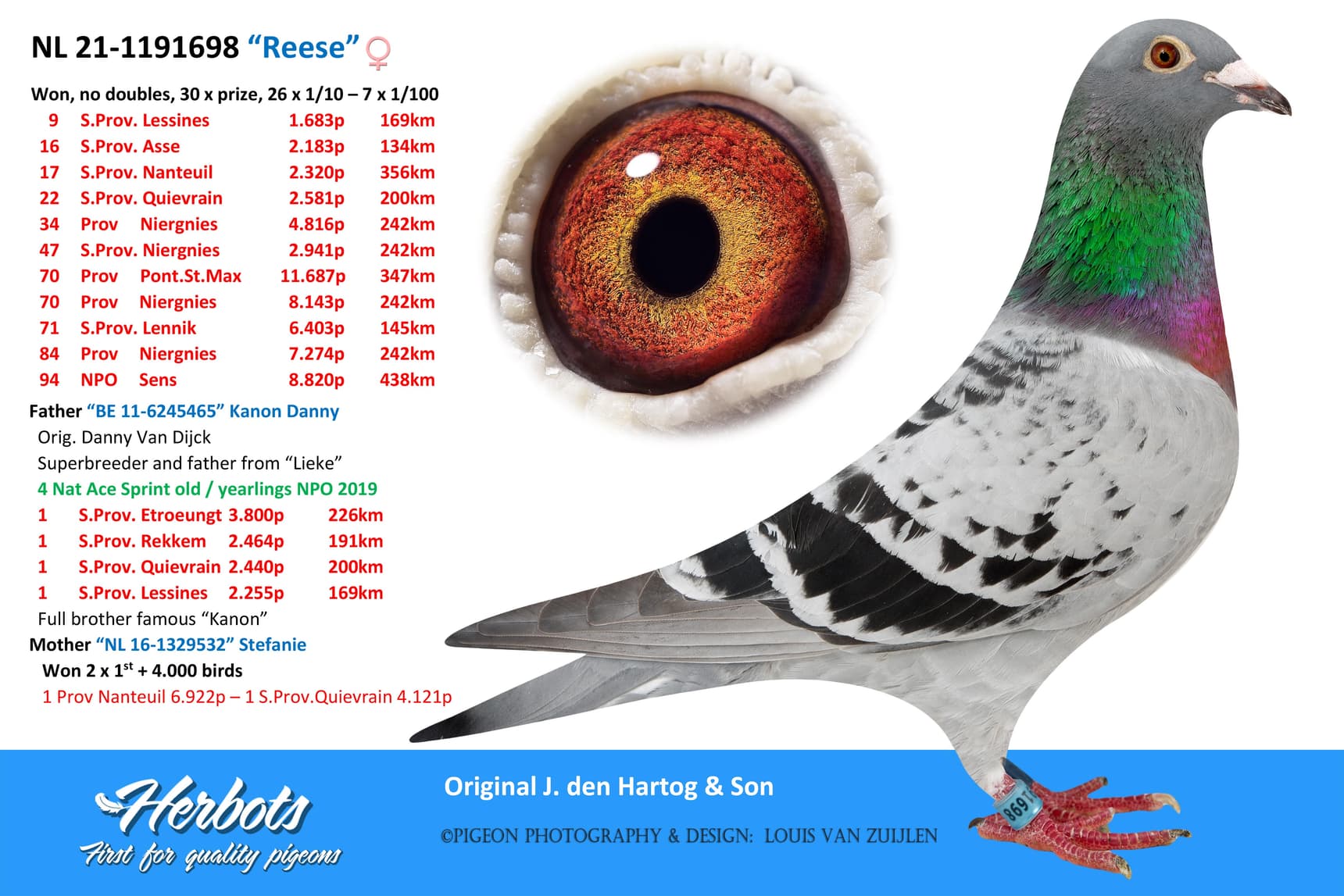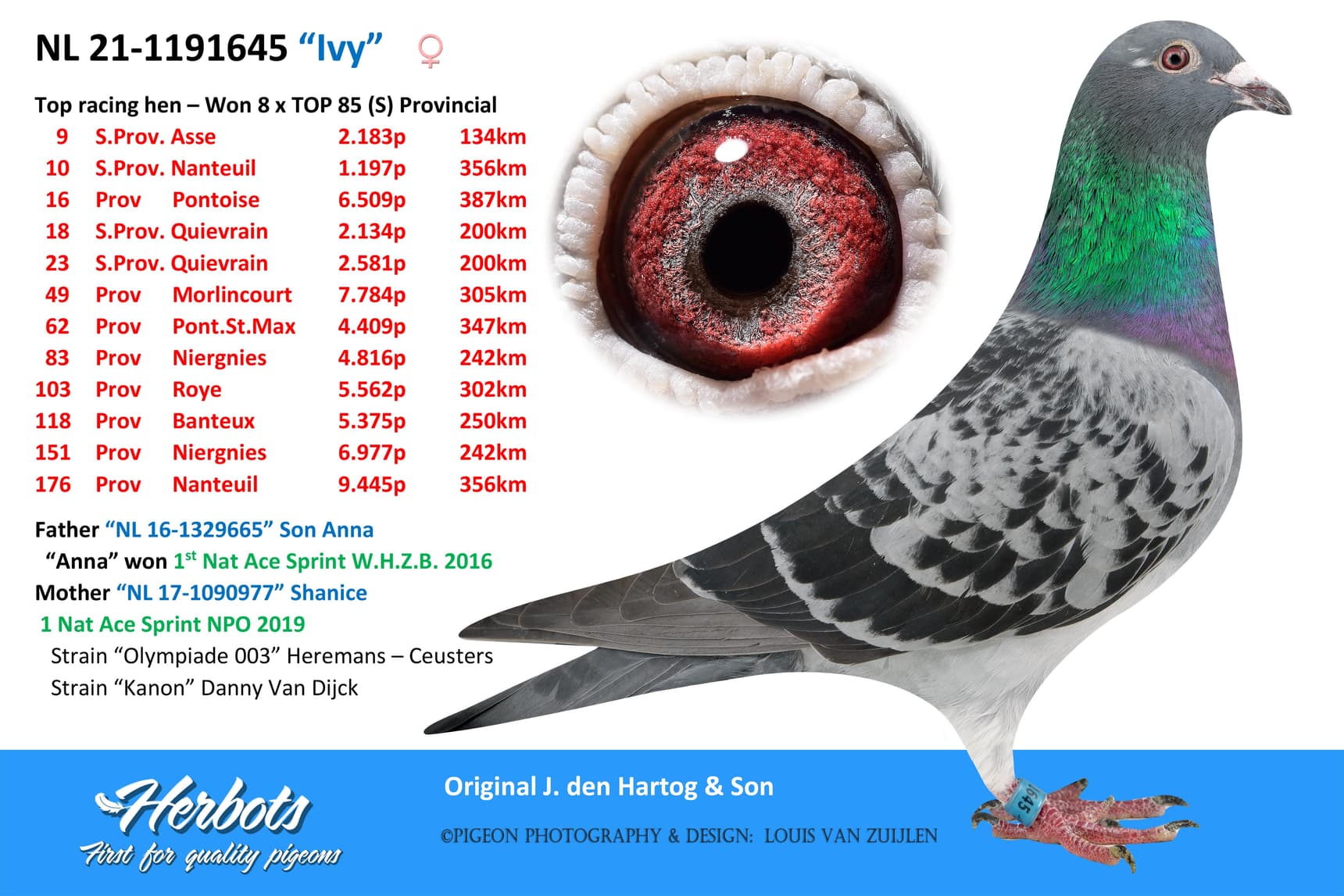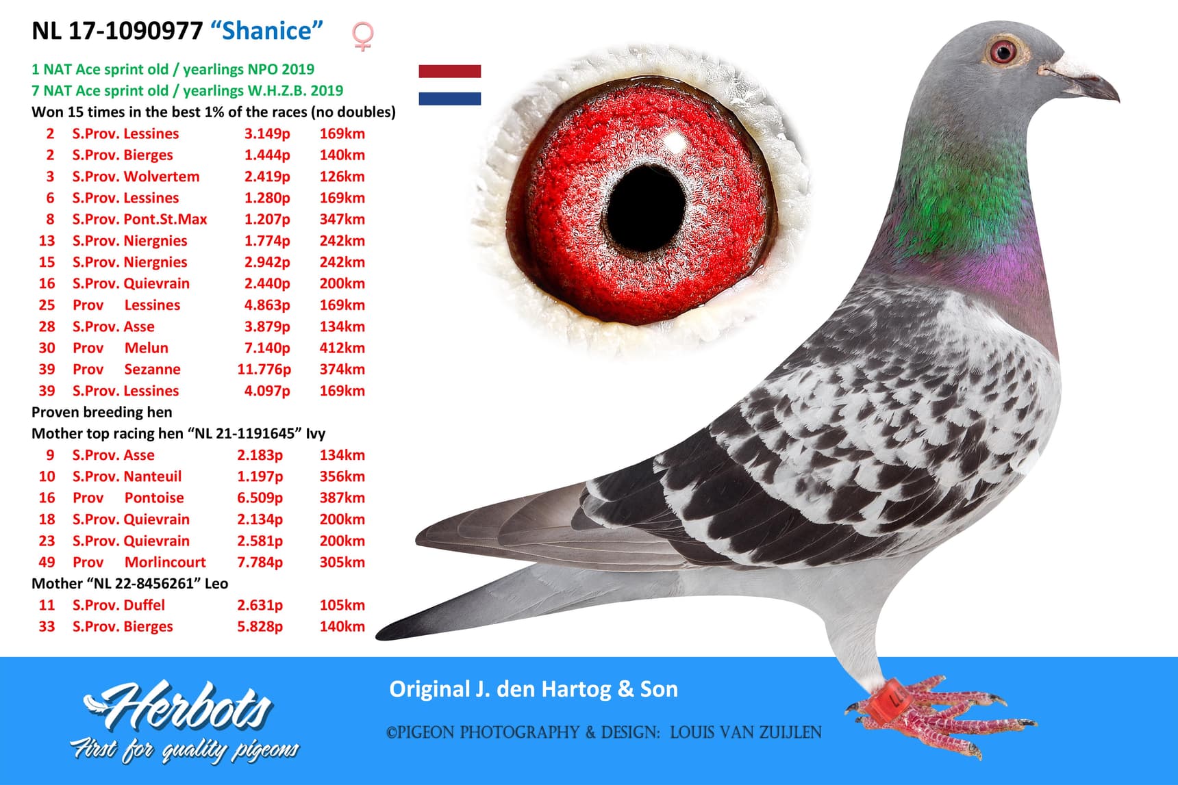 2019 and flew 15 times per 100 in her career, her list of achievements is too long to write down everything this hen has achieved in her racing career. She became the mother of top hen “Ivy” and “Leo” who are also present in this sale. “Shanice” itself is a daughter of “Inbred Olympiade 003” x “Sister Kanon” from Danny Van Dijck.