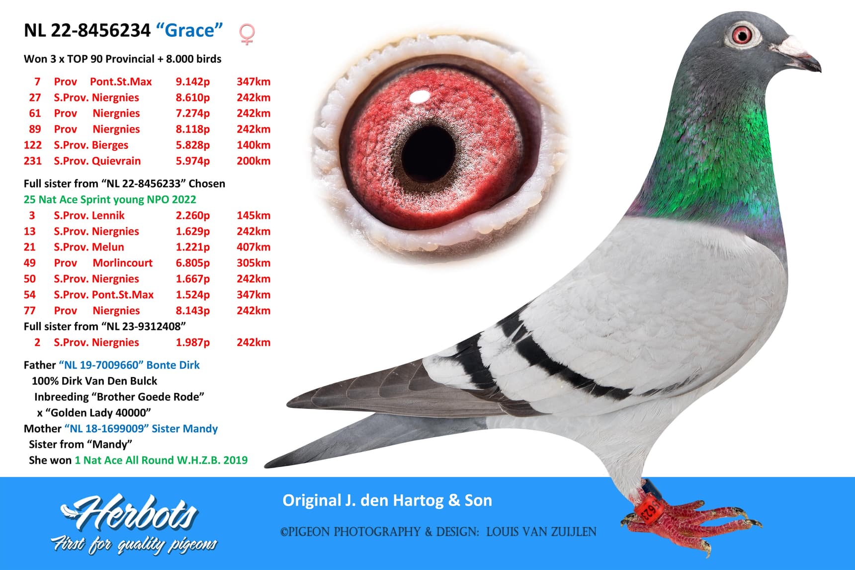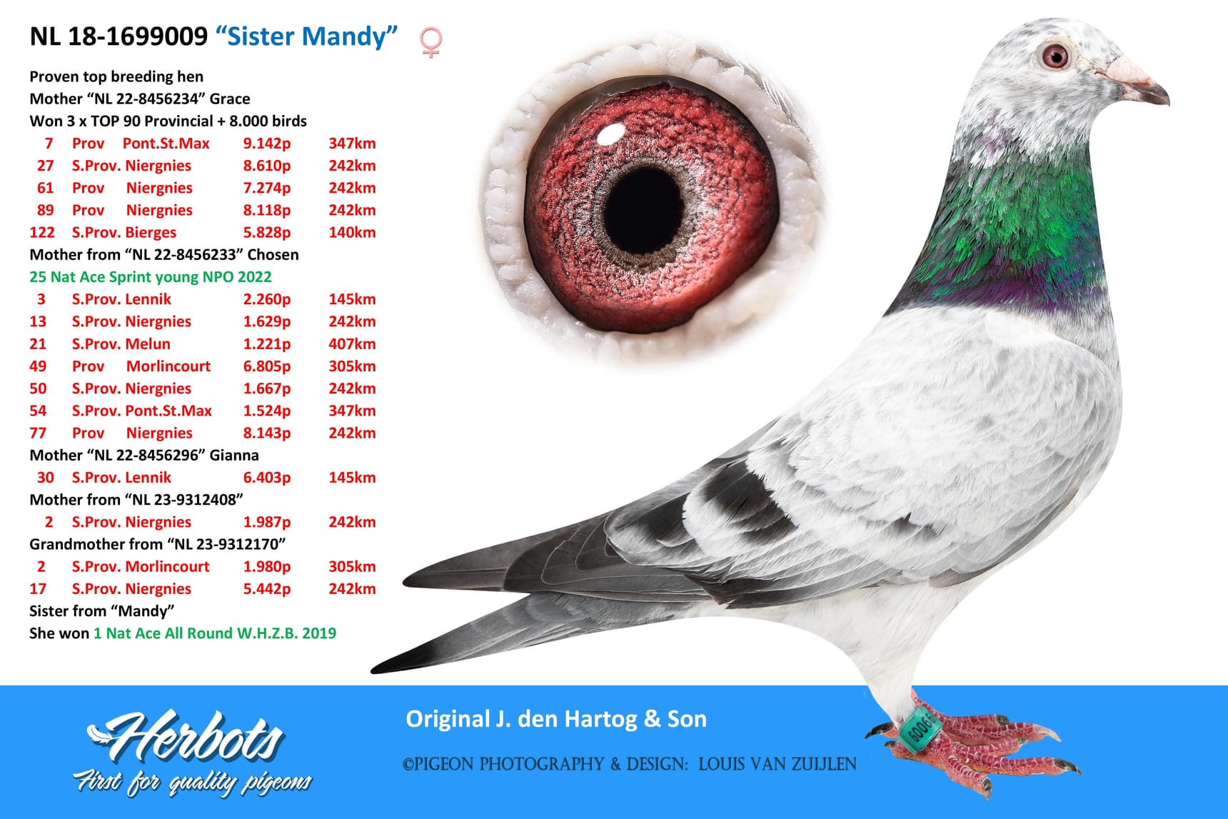 She is a full sister of “Mandy” 1st National Ace Pigeon All Round WHZB 2019 and mother of previous top bird “Chosen” and other top birds that will follow.