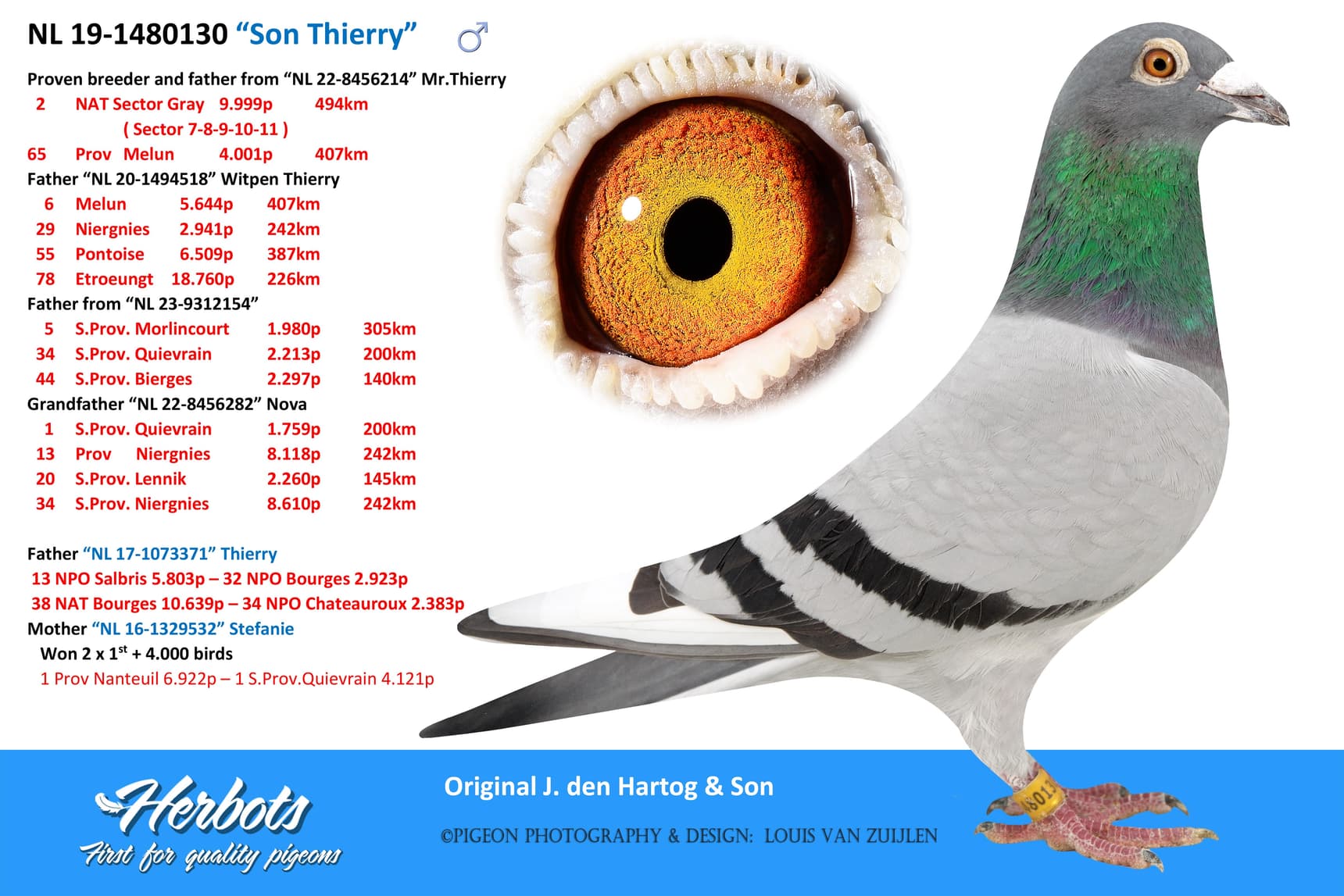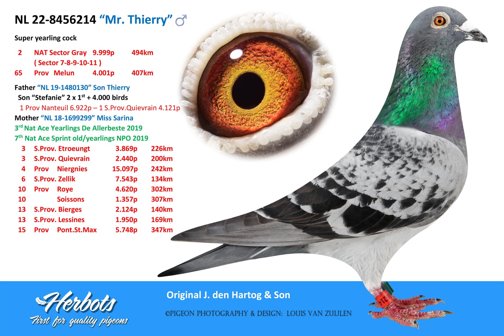 This season he won 2nd National Sector Gray against 9,999 pigeons at a distance of 494km. A yearling cock made from the right wood. His mother is super hen “Miss Sarina” who became 3rd Nat. Ace Pigeon De Verybest 2019 and his father is super breeder “Son Thierry” (he is a son of “Stefanie” who is also in this sale and who won 2x 1st against more than 4,000 pigeons).