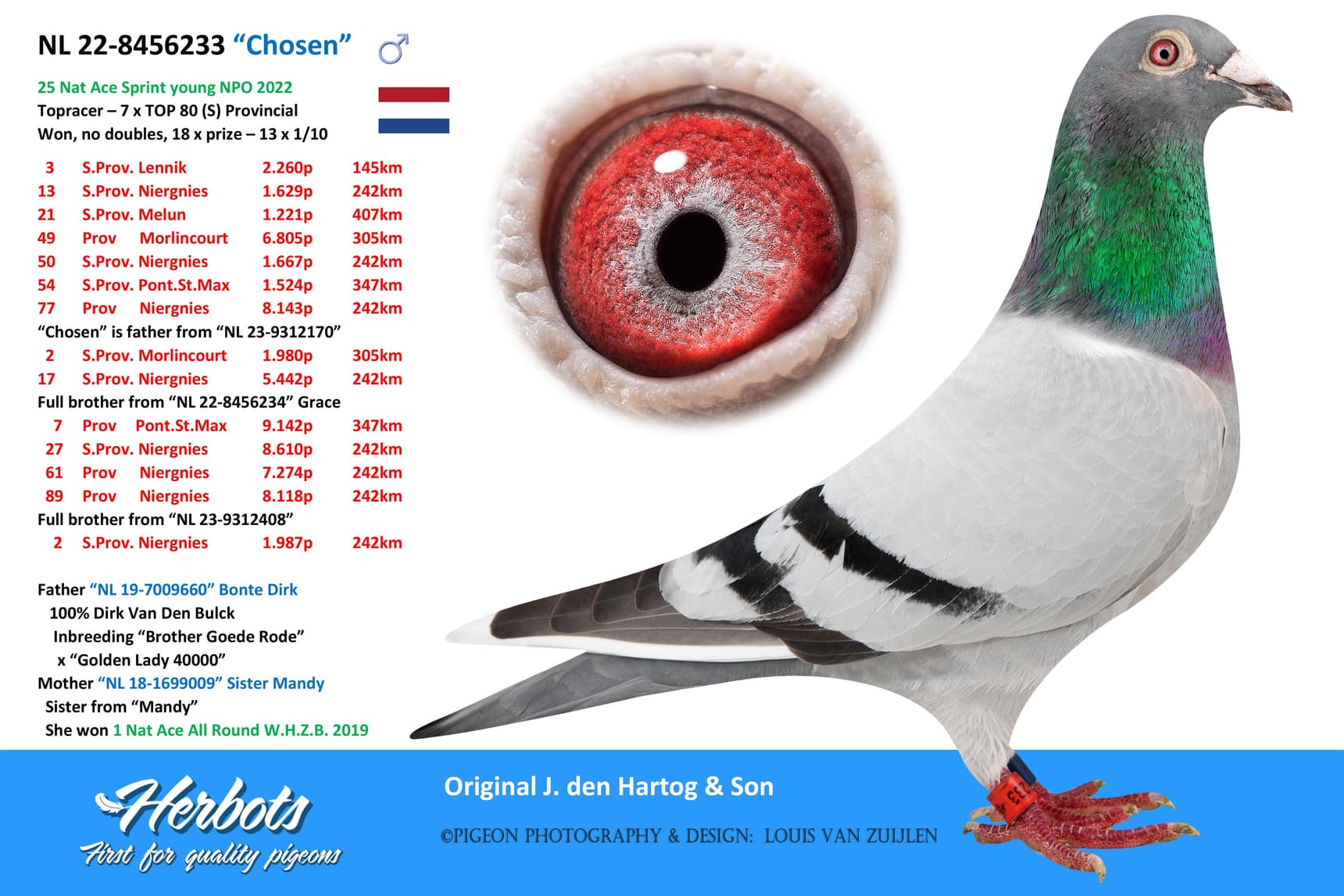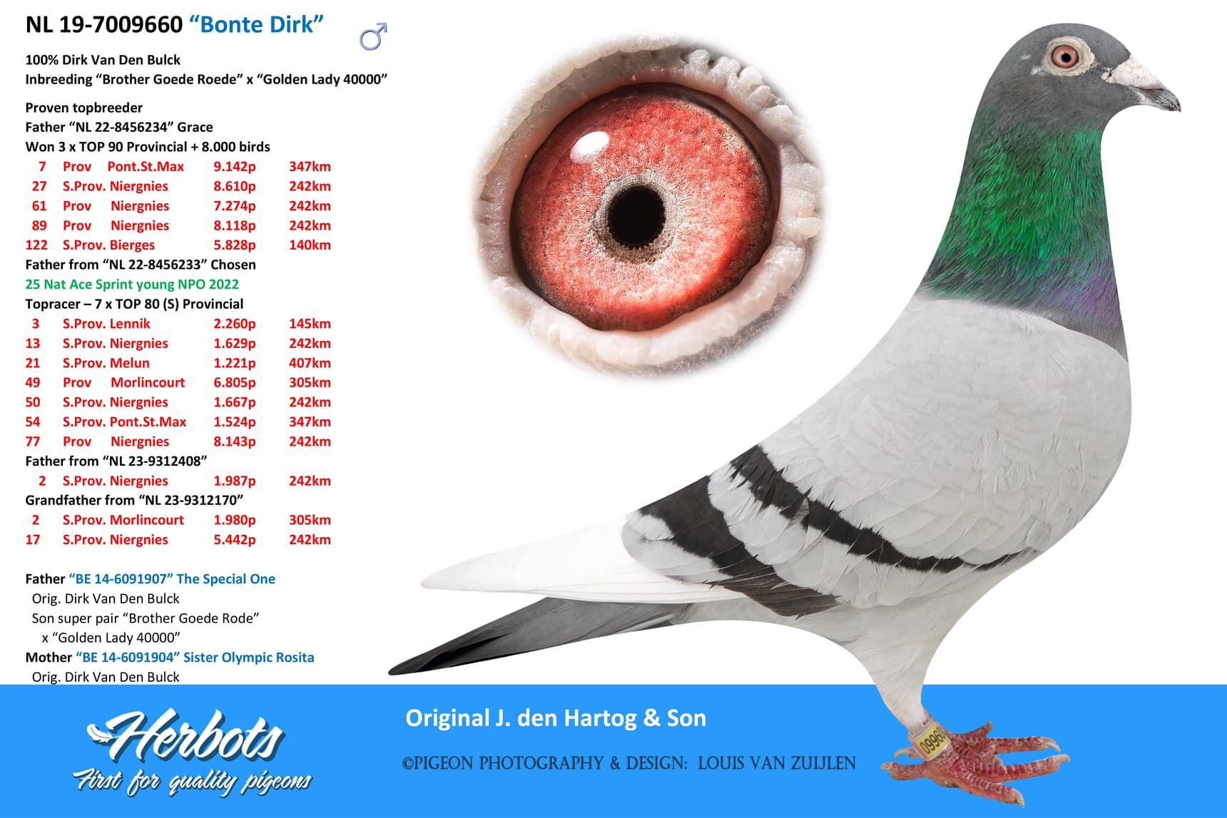 The top breeder and 100% Dirk Van Den Bulck, inbred to the super couple “Brother Goede Rode” x “Golden Lady 40000” and father of several top pigeons including “Chosen” 25th National Ace Pigeon speed youngsters NPO 2022