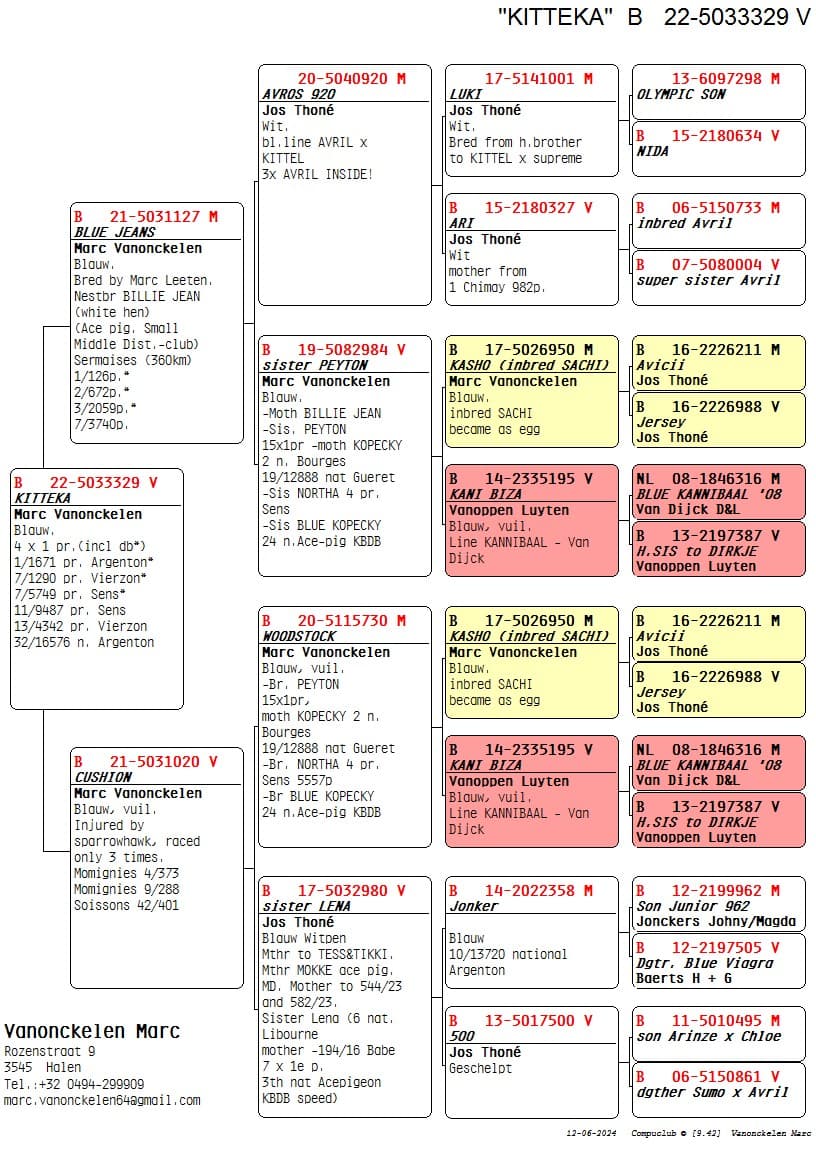 Daughter of “ 730/20” Brother Peyton, who won 15 x 1st and is mother of “Kopecky” 2 Nat Bourges 9,922p x “980/17” Sister Lena Jos Thone, “Lena” won 6 Nat Libourne