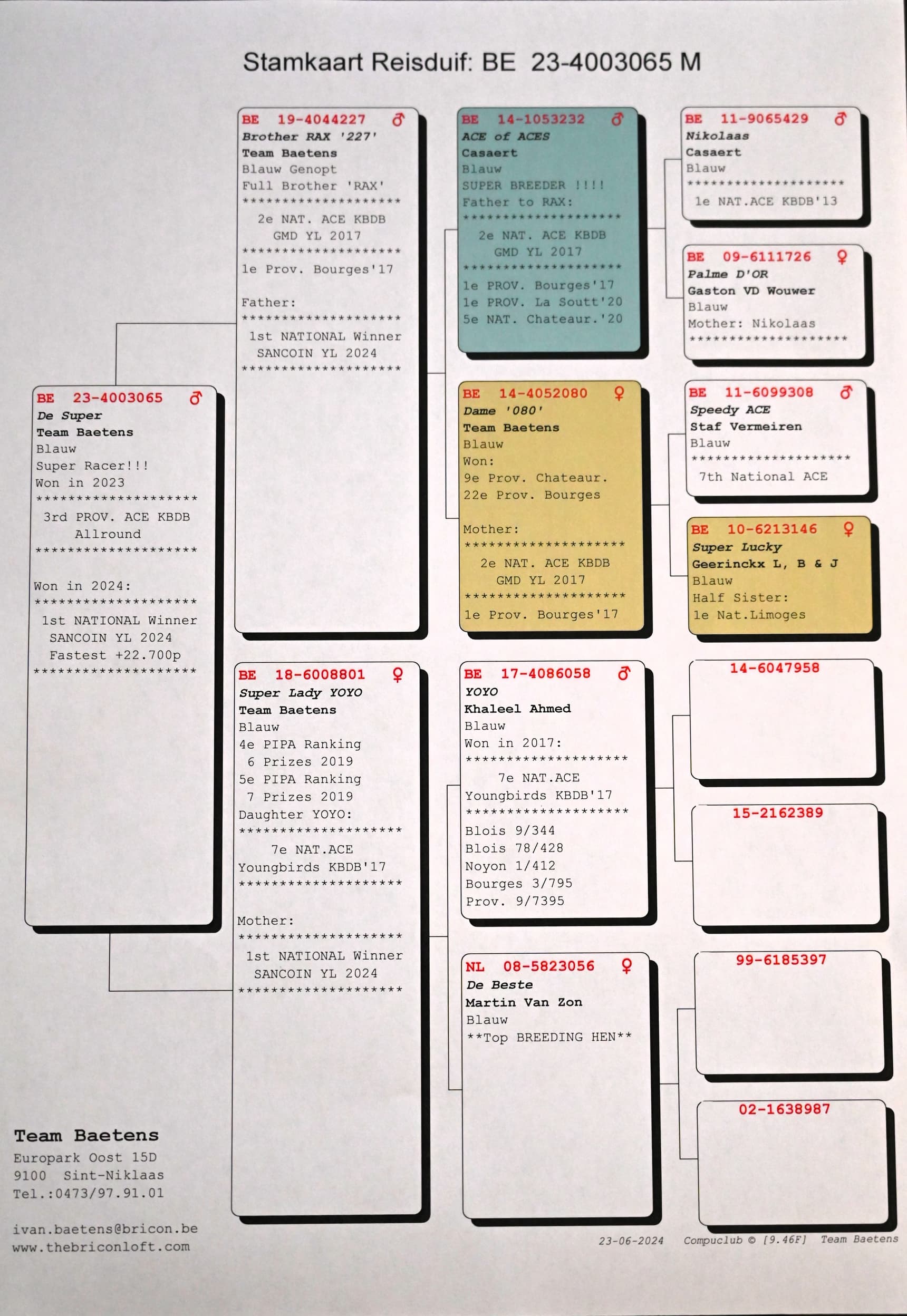 So what we just said about not sparing pigeons starts here as a young pigeon. They have to fly the national flights with a view to their further career. “Yoyo” was such a young pigeon in 2017 that won 9 Provincial Bourges 7,395p - 54 National Chateauroux 18,499 and 178 National Chateauroux against 12,150 pigeons. This made him 7th National Ace Pigeon longer middle distance youngsters KBDB 2017. The offers came to sell this pigeon, but Ahmed realized that this topper “Yoyo” together with his family might be something very special that he had in his hands here and all family remained in the lofts. Now 7 years later, this turned out to be the golden move towards the success of the following years. The family ensures fantastic results in the breeding loft, including “Yoyo”. This year he became the grandfather of a 1st National Sancoins against 12,958 pigeons from Team Baetens in St.Niklaas and this was also the fastest pigeon of 22,711 pigeons.