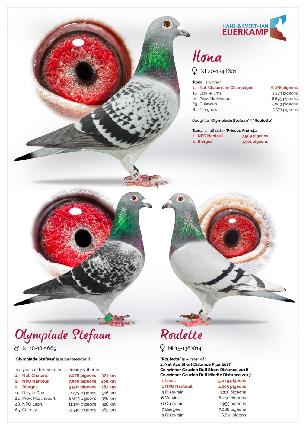 Mother is granddaughter for the Olympic Leo, bred by Gordon Bros and Sons, out of the NL17-1820216 "King Leo", direct son Olympic Leo x daughter of Nieuwe Olympiade, both undisputable 2 top breeders in the loft of Hans and Evert-Jan Eijerkamp.