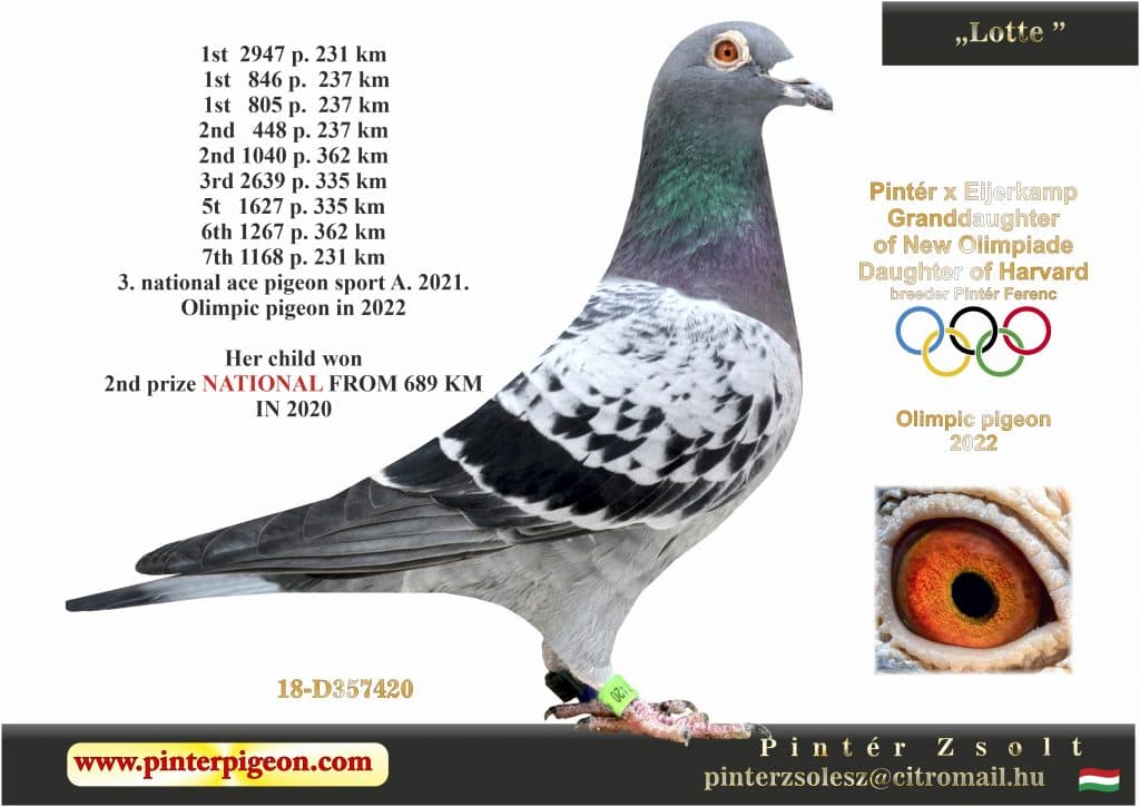 The HU18-D-357420 was bred from "Lady Olympiade", NL15-1897858, a direct daughter of the Nieuwe Olympiade which his brother Ferenc bought at the Eijerkamp lofts in October 2015 when she just was 6 weeks of age. The mother for the "Lady Olympiade" is Carmen, a pure Eijerkamp-Janssen who also is mother to the super hen Honda.