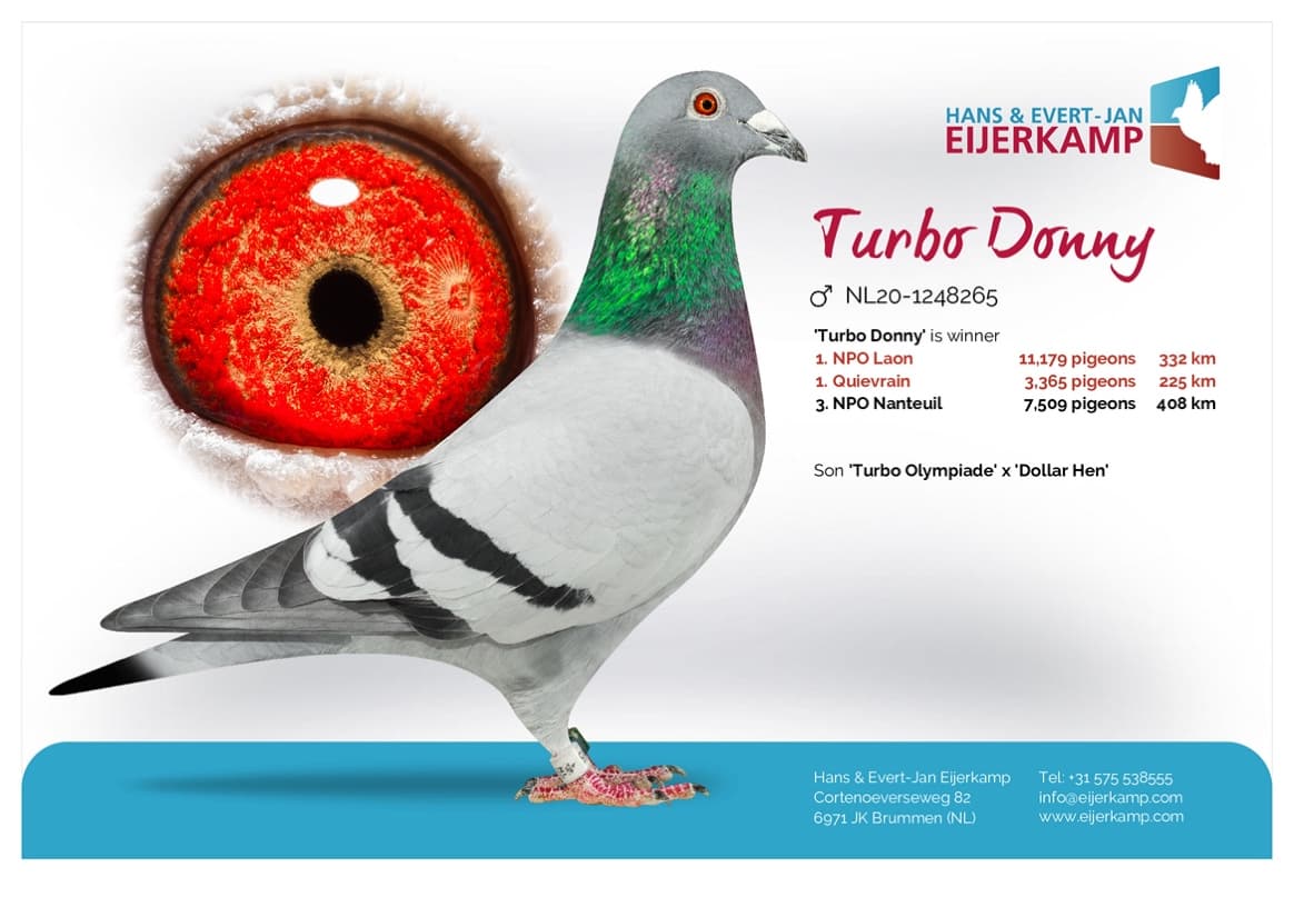 The blue cock ‘Turbo Donny’ was winning in 2020 a mayor NPO race from Laon and 2 weeks later again he surprised the Team by winning 3rd NPO Nanteuil. After these 2 Top prizes the goals were set for the 2021 season and again he did !!!!. He now winning 1. Quievrain against 3,365 pigeons. 3x 1:1000 prizes in only a small number of races were enough to move him direct to the breeding lofts as his grandfather ‘Nieuwe Olympiade’ is worth perhaps 10 times the amount what the Eijerkamp family paid 10 years ago now. ‘Turbo Donny’ is bred out of ‘Turbo Olympiade’, son of ‘Nieuwe Olympiade’ paired to top breedtser ‘Dollar Hen’ who is daughter of the ‘Lichte Blauwe’ paired to granddaughter of ‘Kadootje’ who is another super daughter of the ‘Nieuwe Olympiade’