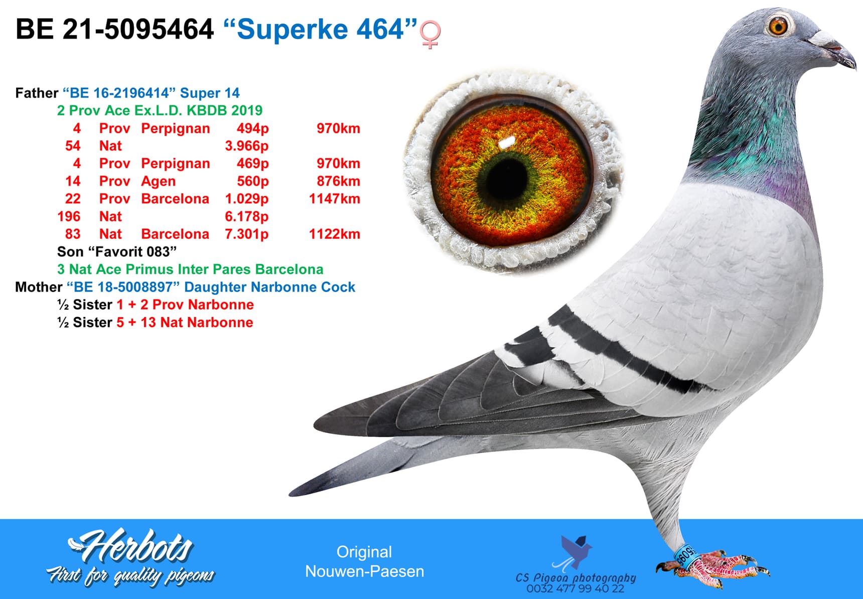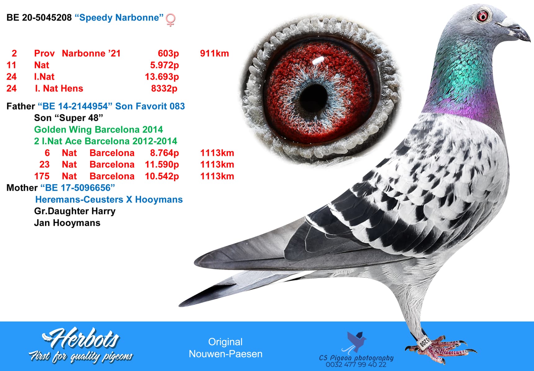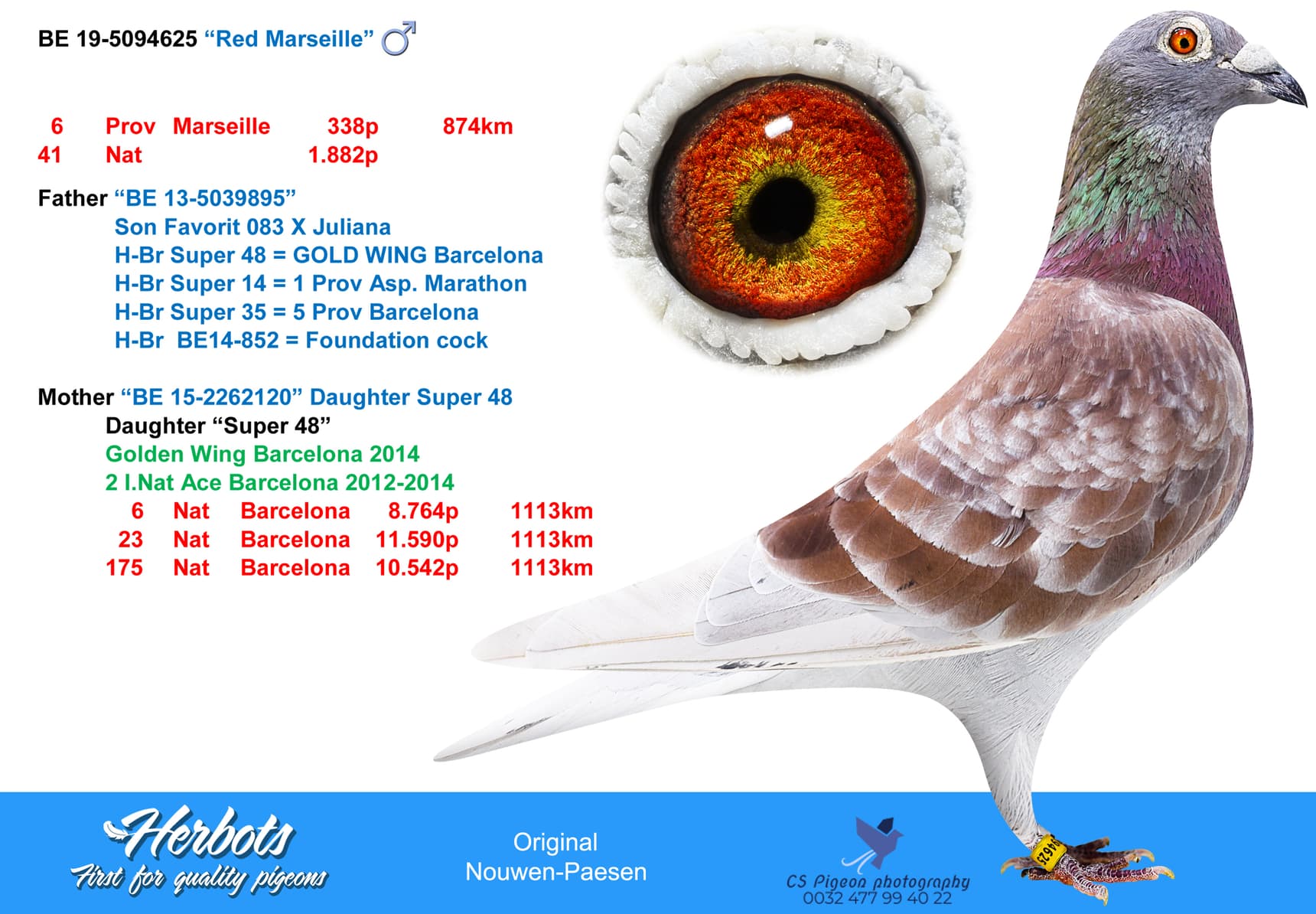 The long distance and extreme long distance blood of the tandem Nouwen – Paesen goes on for many years, for 50 years to be more exact. Now it is especially son Dirk that takes care of everything in a matter of care and training and father Jaak criticizes the best pigeons due to his years of experience. But they are still convinced that you have to keep your best racers on the extreme long distance and put them on the breeding loft. This is what Jaak already did from the very beginning with pigeons that could be used for 4 to 5 generations at the top. After their big sale they went on with a young team where you can state that a new generation 2.0 is ready to take over. The thread is still the base breeder “BE 05-5171083” Favorit 083. He was himself 3rd Ace bird Primus Inter Pares Barcelona and his children and grandchildren do even better than him. A perfect example is “Super 48” who won 6,23 and 175 National Barcelona. This topper moved to England where he already gave 3 different national winners.