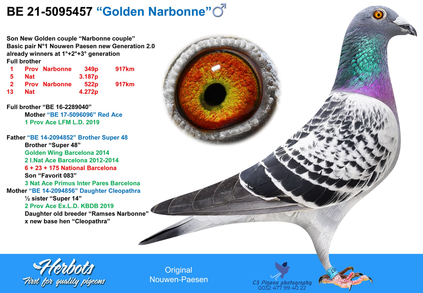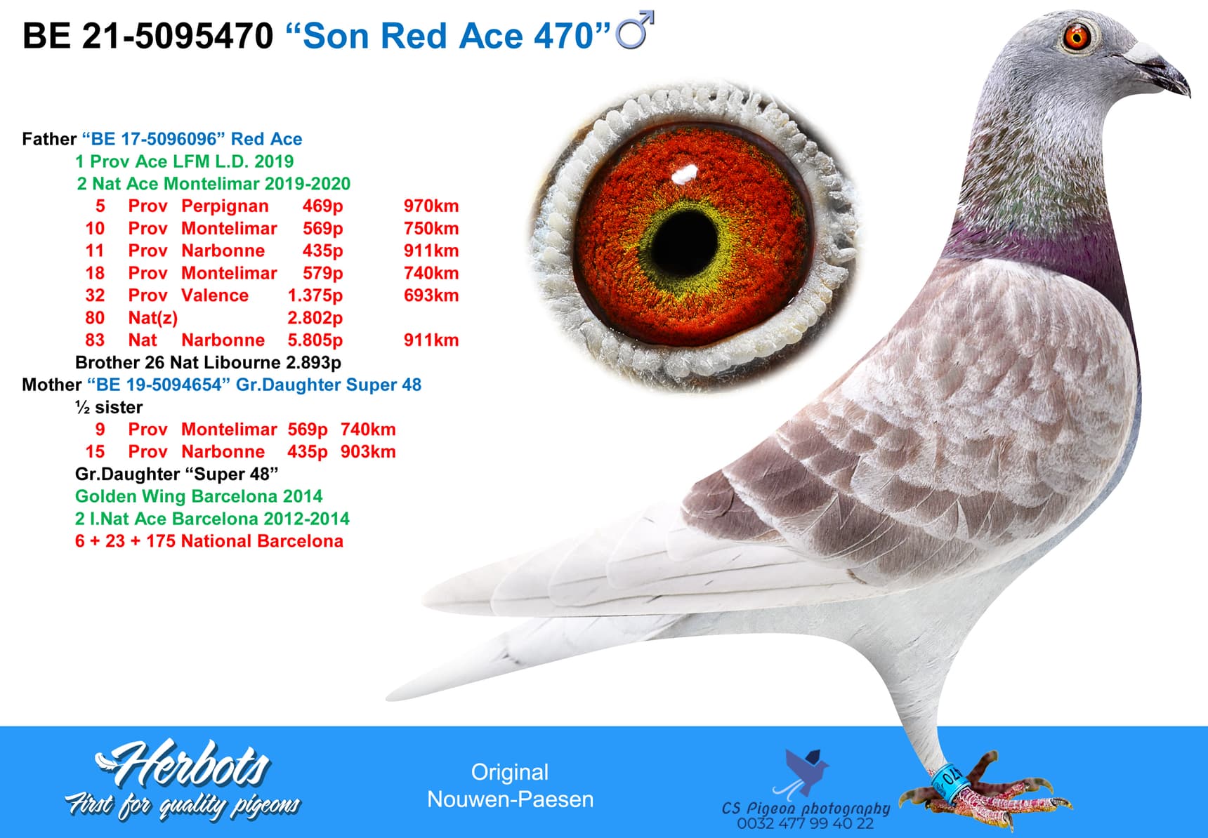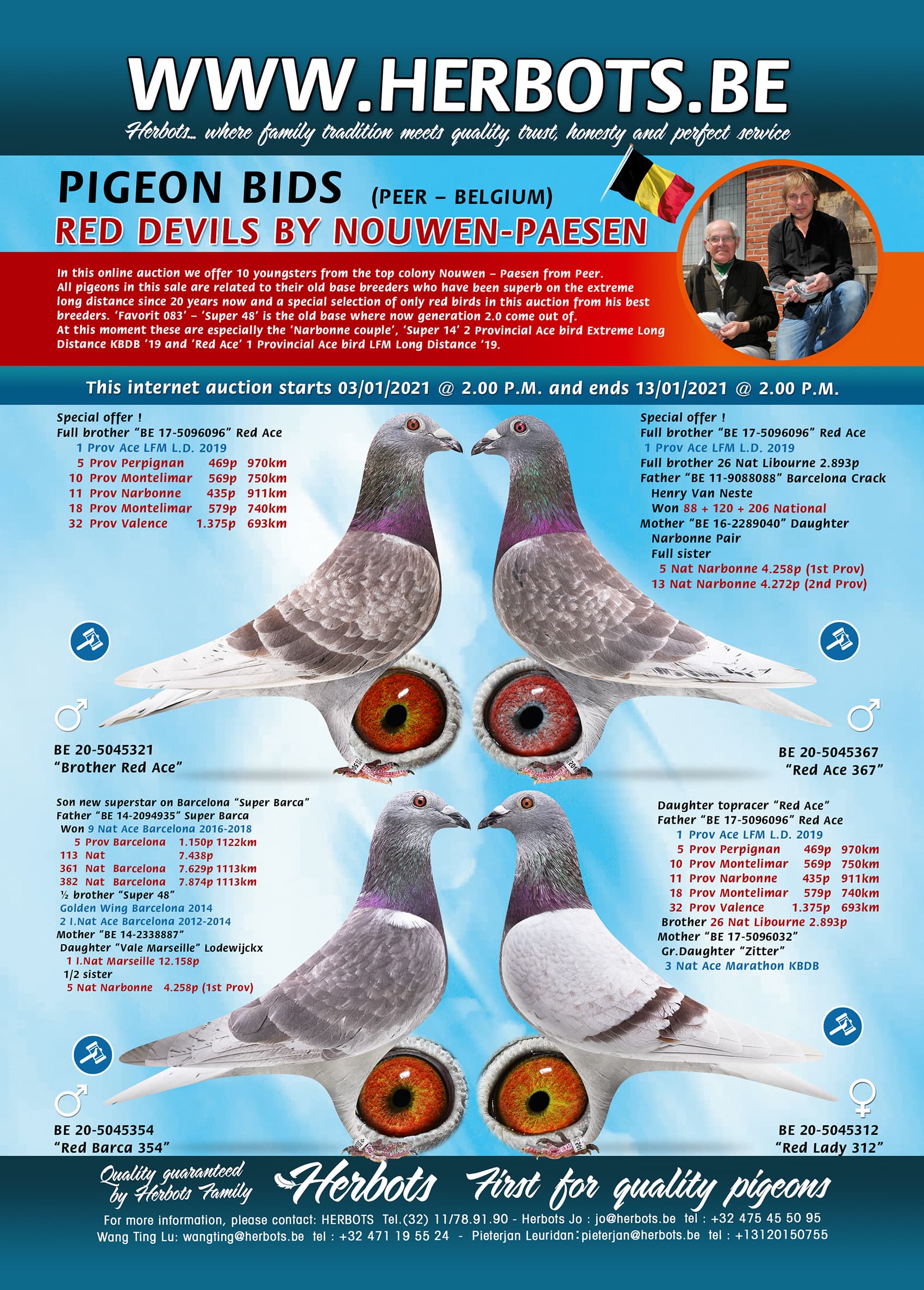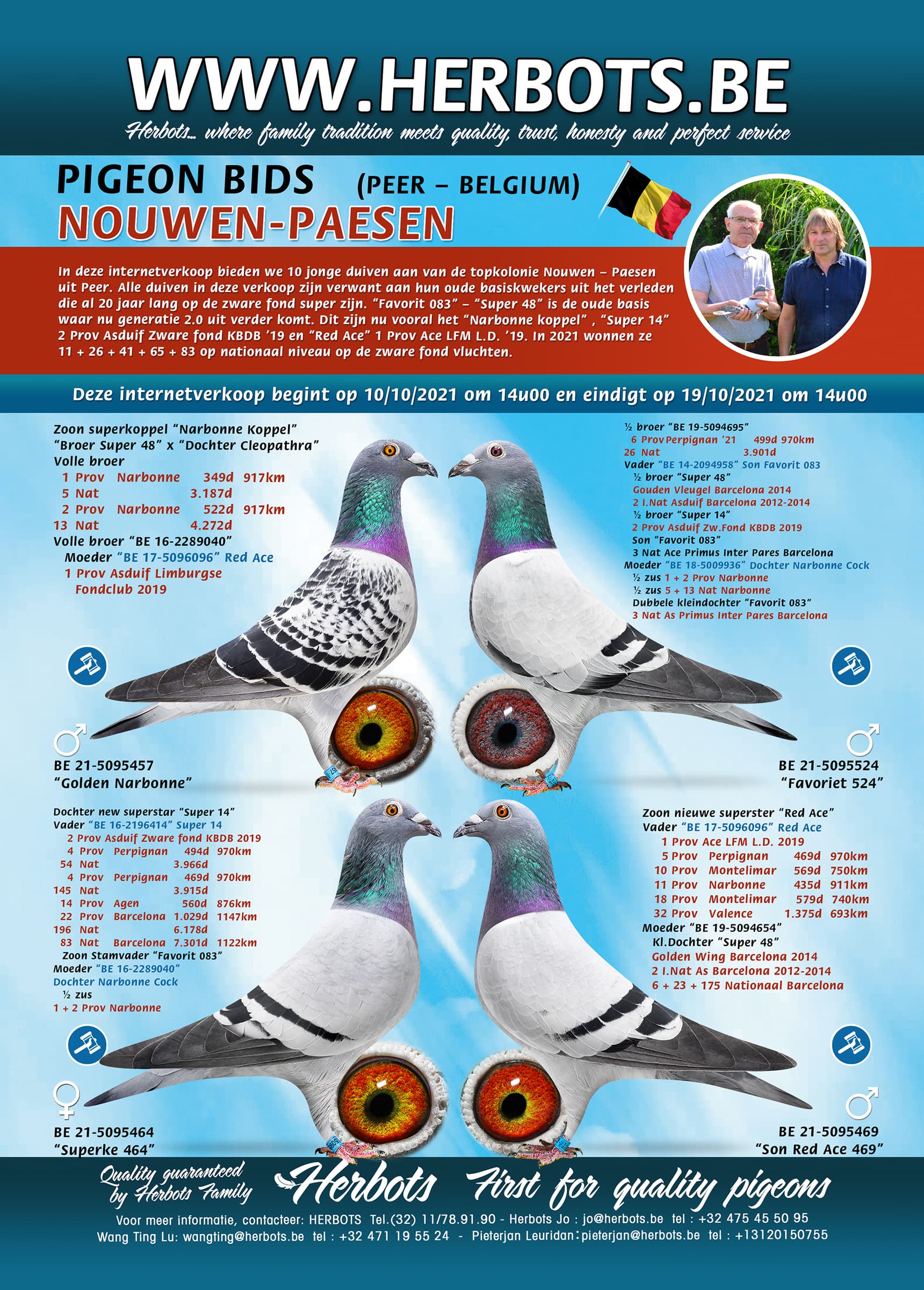 The long distance and extreme long distance blood of the tandem Nouwen – Paesen goes on for many years, for 50 years to be more exact. Now it is especially son Dirk that takes care of everything in a matter of care and training and father Jaak criticizes the best pigeons due to his years of experience. But they are still convinced that you have to keep your best racers on the extreme long distance and put them on the breeding loft. This is what Jaak already did from the very beginning with pigeons that could be used for 4 to 5 generations at the top. After their big sale they went on with a young team where you can state that a new generation 2.0 is ready to take over. The thread is still the base breeder “BE 05-5171083” Favorit 083. He was himself 3rd Ace bird Primus Inter Pares Barcelona and his children and grandchildren do even better than him. A perfect example is “Super 48” who won 6,23 and 175 National Barcelona. This topper moved to England where he already gave 3 different national winners.