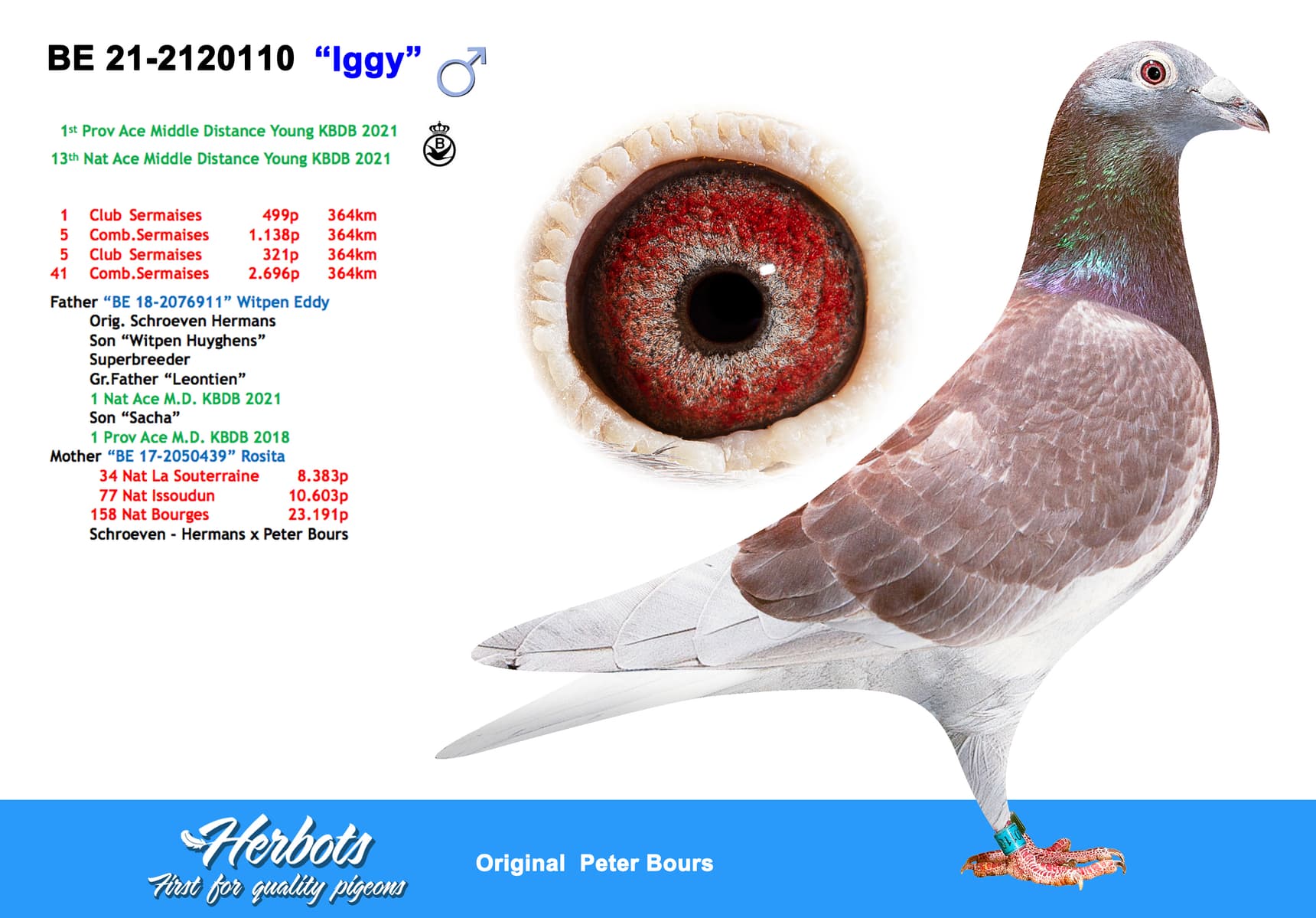 Here too Peter stood his ground and we all wonder what he can't do? Or in other words what his pigeons can't really do, because in between all that violence of national flights he wins with superstar “Iggy” the 1st Prov Ace pigeon middle distance youngsters KBDB and with another young cock “Invicta” he wins 1st Int.Prov Ace pigeon extreme middle distance youngsters in Derby Hainaut. From young bird to 5 years old, they can do everything and they perform on all distances !!! The Bours pigeons are real all round pigeons.