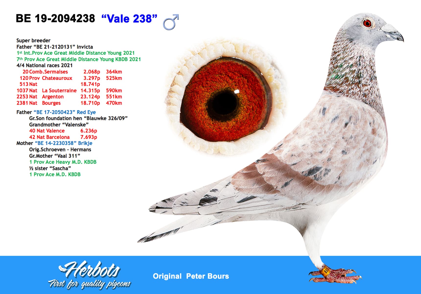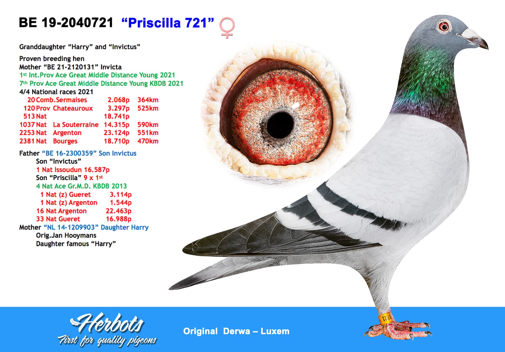 This hen comes directly from the super colony of Albert Derwa – Luxem and is a granddaughter of “Invictus” 1st National Issoudun 16,587b, “Priscilla” 9 x 1st and 4th National Ace Pigeon Extreme Middle Distance KBDB and of “Harry” from Jan Hooymans where Albert has already bred super pigeons.