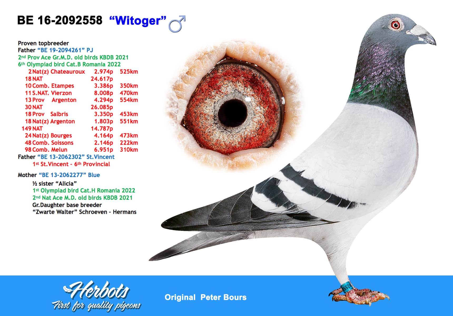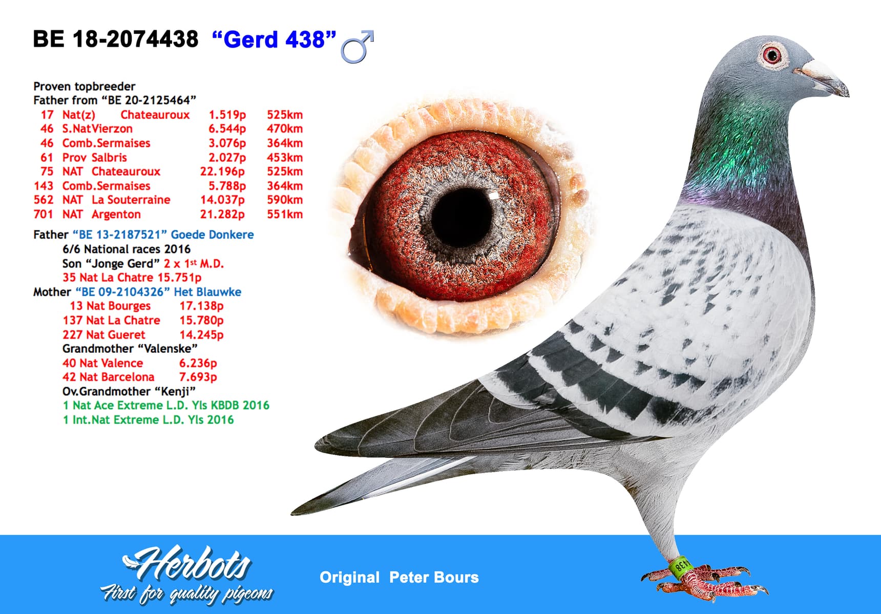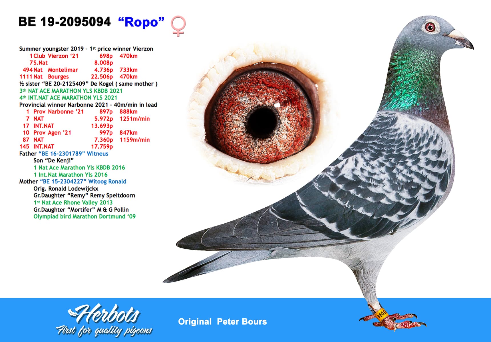 This is a cock from the heart of the colony and a direct son of top hen “Het Blauwke”. He became the father of "464/20" a super yearling who shone several times in the extreme middle distance and will become the leader in Peter's racing team for the 2022 season