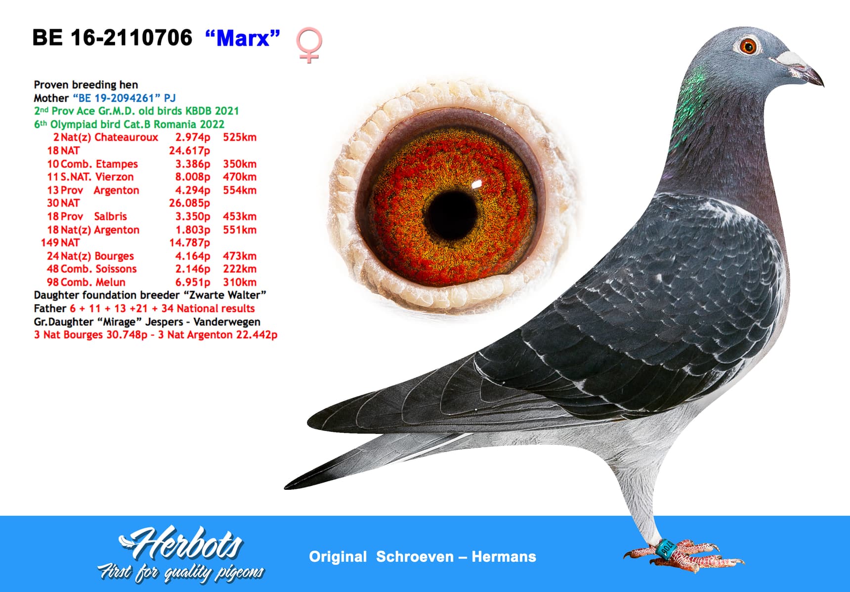 Is a cross between the very best of Schroeven – Hermans ( stock father Zwarte Walter ) x Dochter Mirage van Jespers – Vanderwegen who won 2 x 3rd National.
