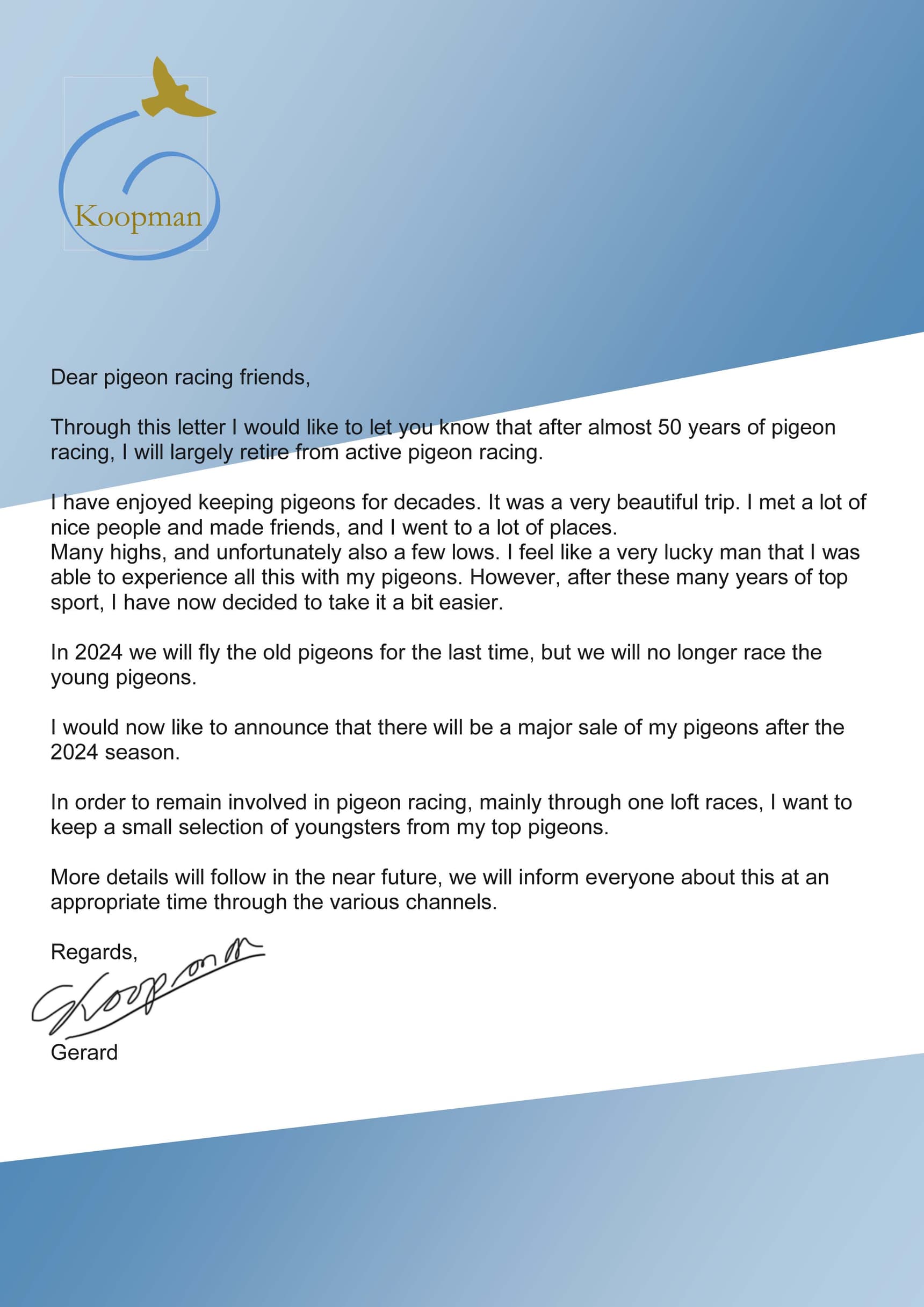 pigeon legend gerard koopman (ermerveen) quits active pigeon racing at the end of 2024