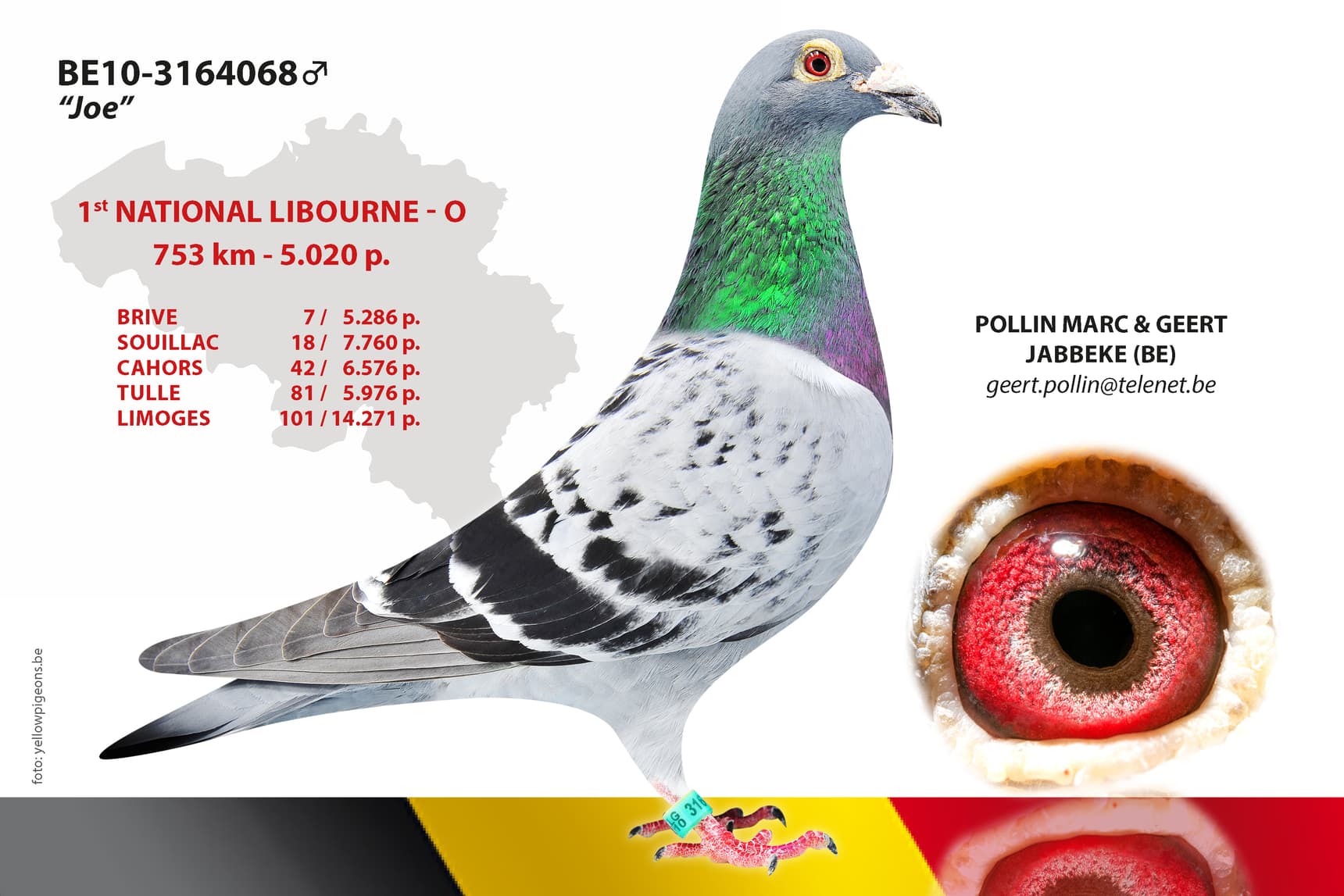 "Joe" is a real topper and a real long distance crack. With an already very nice palmares, he has now put his icing on his cake with the national win at Libourne of 5,020 old birds.