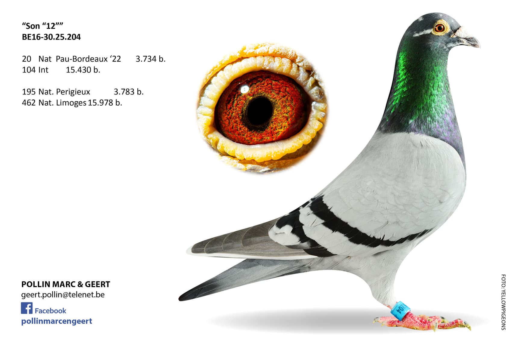He is a son of the "12" which itself was a very gifted racer with numerous national top prizes and which in turn is a son of the famous top breeder the "Dortmunder". We also find traces of the national winner Limoges. The "12" was mated to a daughter of that other topper "Cadel" and on the grandmother's side we find the origin of the national winner Perpignan. The best historical blood of the Pollin strain united in this top pigeon. What a winner !