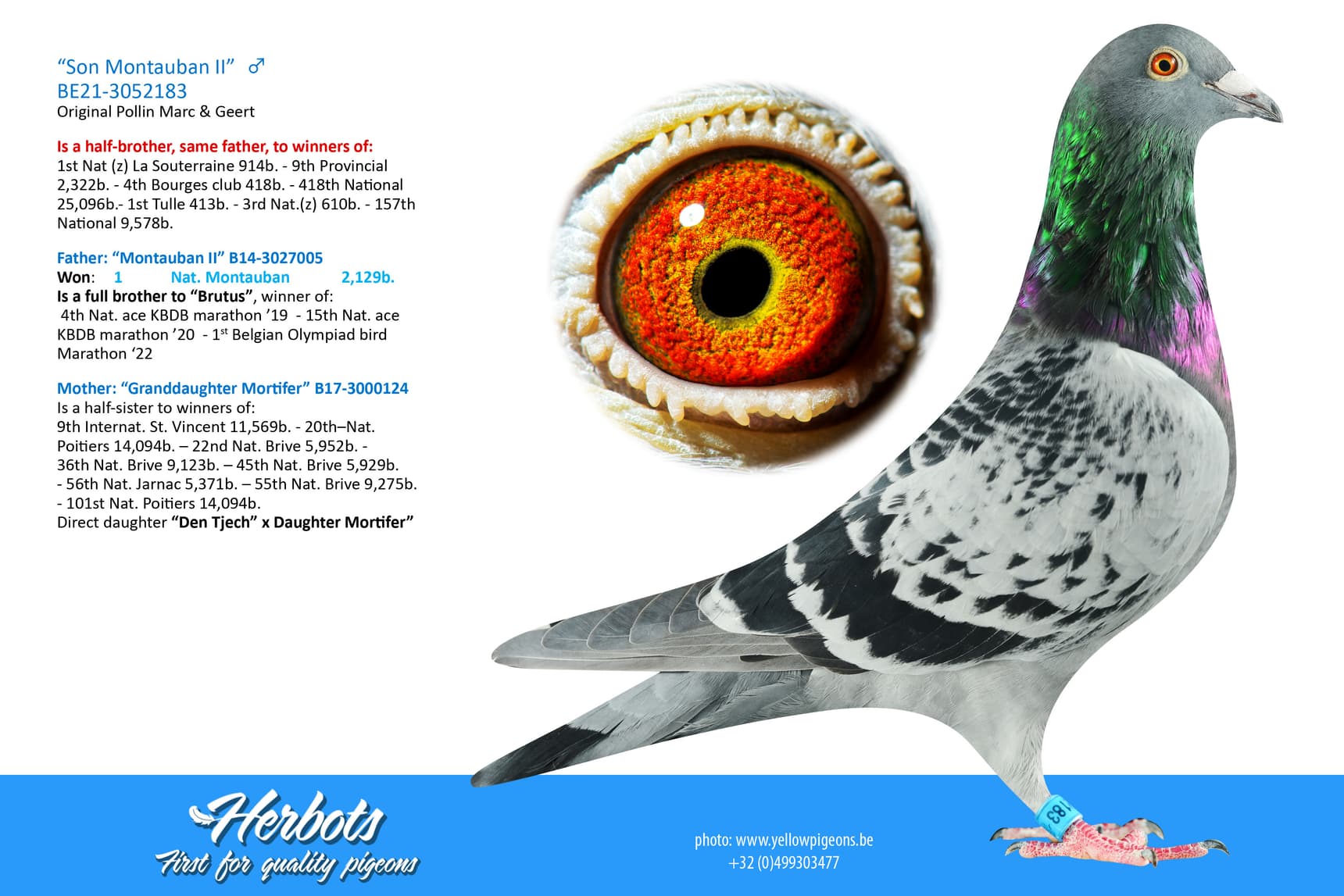 The national winner of Montauban was born from the pairing "Joske" x "Sister Naï". "Joske" BE09-3091293 is the result of breeding together with Jos Thoné (As). He is a son of "Mortifer" BE03-3002141 (Olympiad pigeon Dortmund 2009) x "Sedna I" BE04-5026055 (Jos Thoné and winner of 1st International Narbonne 5,870d. in 2005). "Sister Nai" BE08-3090193 - is a full sister of current top breeder "Naï".