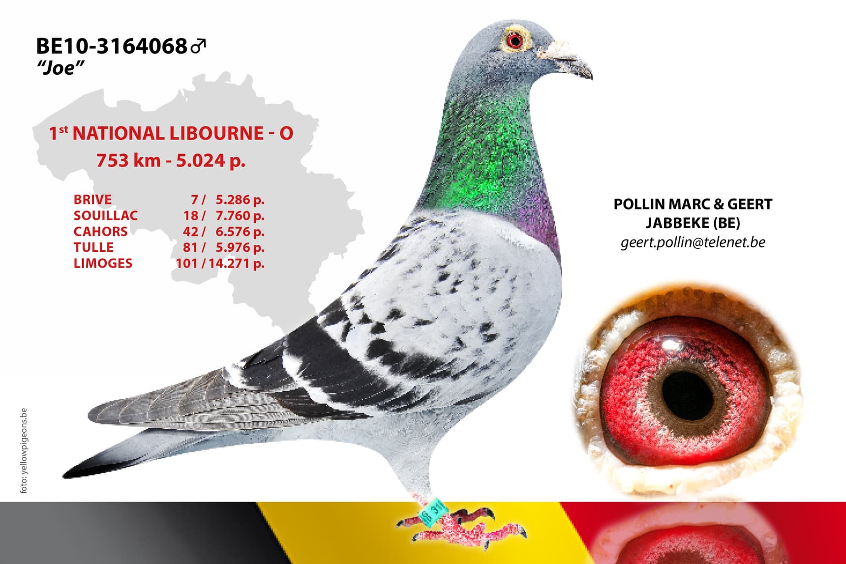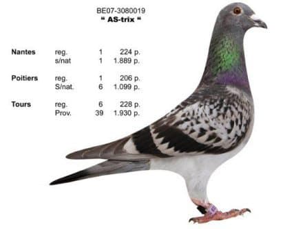 "Provinciaal Poitiers" (B07-3080116): won 1st Provincial Poitiers 1,457 p. – 25th National Limoges 6,138 p. – 36th National Souillac 7,045 p. – 45th National Limoges 11,869 p. – 78th National Chateauroux 17,109 p. – 88th National Limoges 10,448 p., etc.