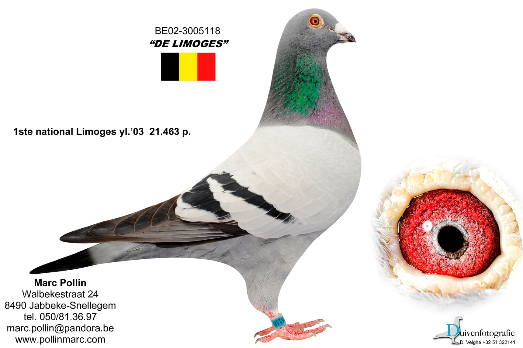 In the same year, 2003, the hen "B03-3017314" was purchased from Boudewijn Jonckheere. This hen was named "J & B" and became the mother of two very important Pollin pigeons, "Dortmunder" and "Nai."