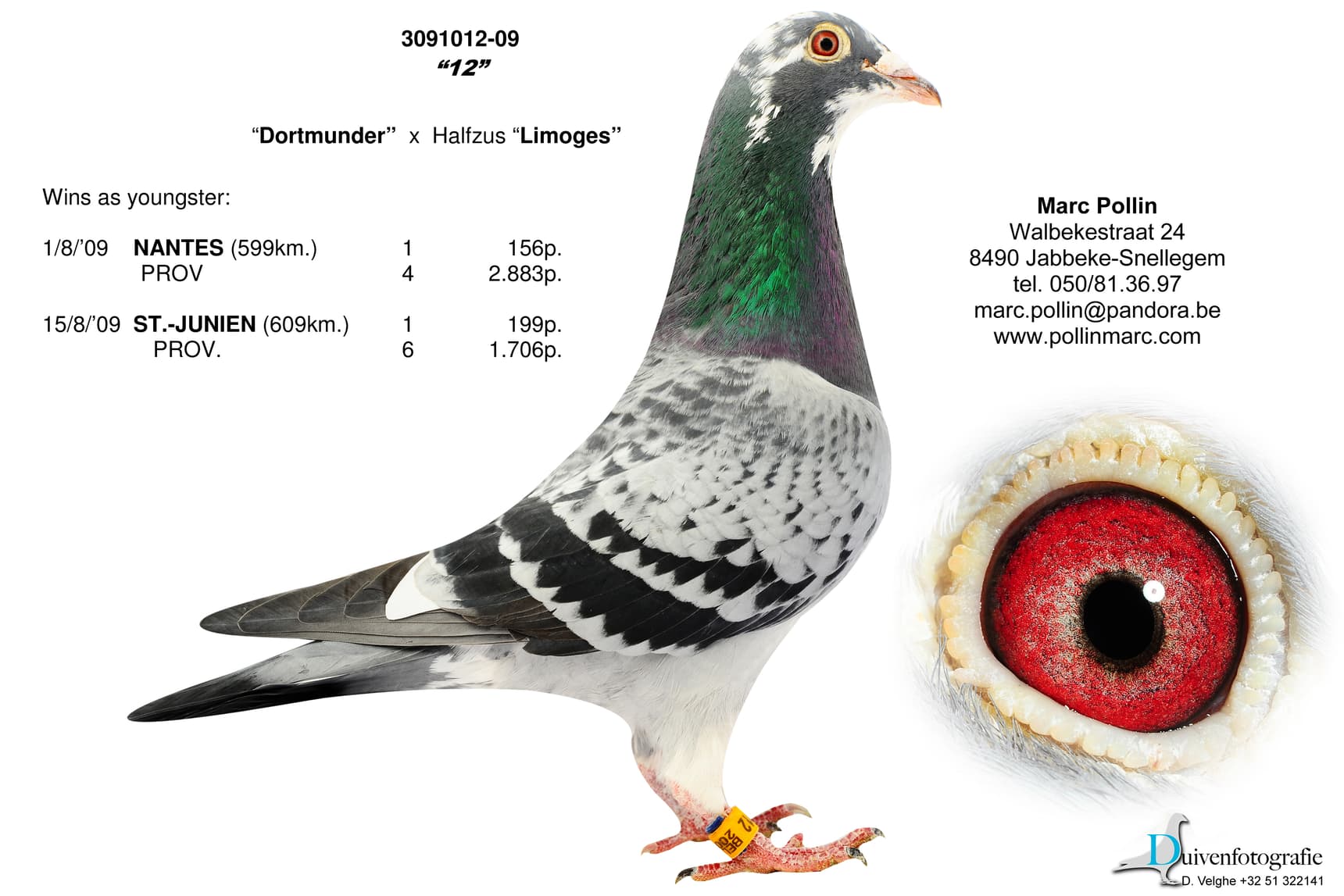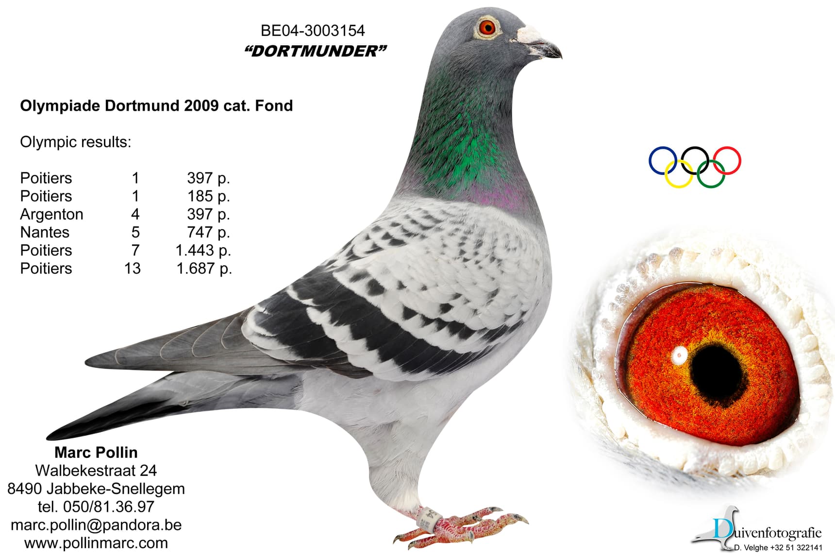 His name is indeed linked to the German city of Dortmund, where the 2009 Pigeon Olympiad took place. In the "Long Distance" category, "Dortmunder" (B04-3003154) represented Belgium and was subsequently assigned a breeding box in Snellegem. "Dortmunder" did not disappoint, and his name still appears in the pedigrees of many important Pollin pigeons.