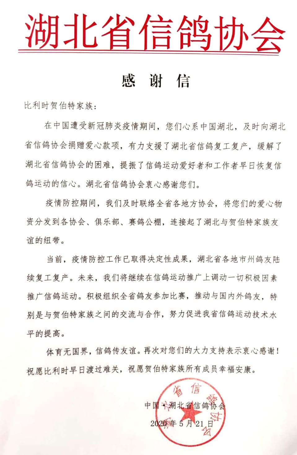 When China was hit hard by the outbreak of the New Coronavirus, you showed your great heart and donated a generous amount of money to the provincial racing pigeon association of the province of Hubei out of concern with the people of Hubei. This helped us a lot with the resumption of our activities, has eased the problems of our association and made that the pigeon fanciers in our region can exercise their hobby again. We as the provincial racing pigeon association of Hubei want to thank you for this from the bottom of our hearts.