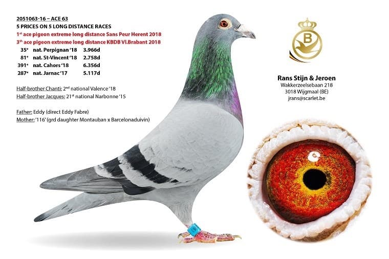 Barcelona, the story of eternal fame when you can add this race onto your palmaris. The past few years a race that is becoming harder and harder, one that takes longer then one day but when in the end the winner is the clear winner on this race, you just have to say, chapeau to the winners ! This edition it are the brothers Stijn & Jeroen Rans from the Wijgmaal. Not a coincidence at all when you know that they already won in 2017 the 1st National Pau and 1st National Perpignan in very hard circumstances and dominated Perpignan TOP 100 national. In 2018 they just continued at this speed and won 2nd national Valence with a ½ sister of the Barcelona winner. And now we get to the real topper of this colony namely “Jef” 2051063/2016. His name used to be ‘Ace 63’ but is being baptised ‘Jef’ now. As a 2-year old cock he showed what he had to offer and this was racing twice Top 100 National on an overnight long distance. He became due to this achievement 1st Ace bird in their club Sans Peur Herent and the 3rd Provincial Ace bird on the Extreme Long Distance. This was their best old pigeon in 2018 as he could take on anything in very hard circumstances. That’s also why they decided to go to Barcelona only with their best once to be able to celebrate. And this is something you can’t get around as ‘Jef’ was clocked at 11:06:59 and at that time the world stood still in Wijgmaal. As there were only a few pigeons clocked in France at that moment. In Belgium he also had 1h30 lead against the 2nd pigeon in Belgium and these two pigeons would also become the 2 first International pigeons, Belgium on top Internationally as no less than 3 Belgium pigeons made it within the TOP 5 International and above you could see ‘Jef’ shining after his amazing achievement.