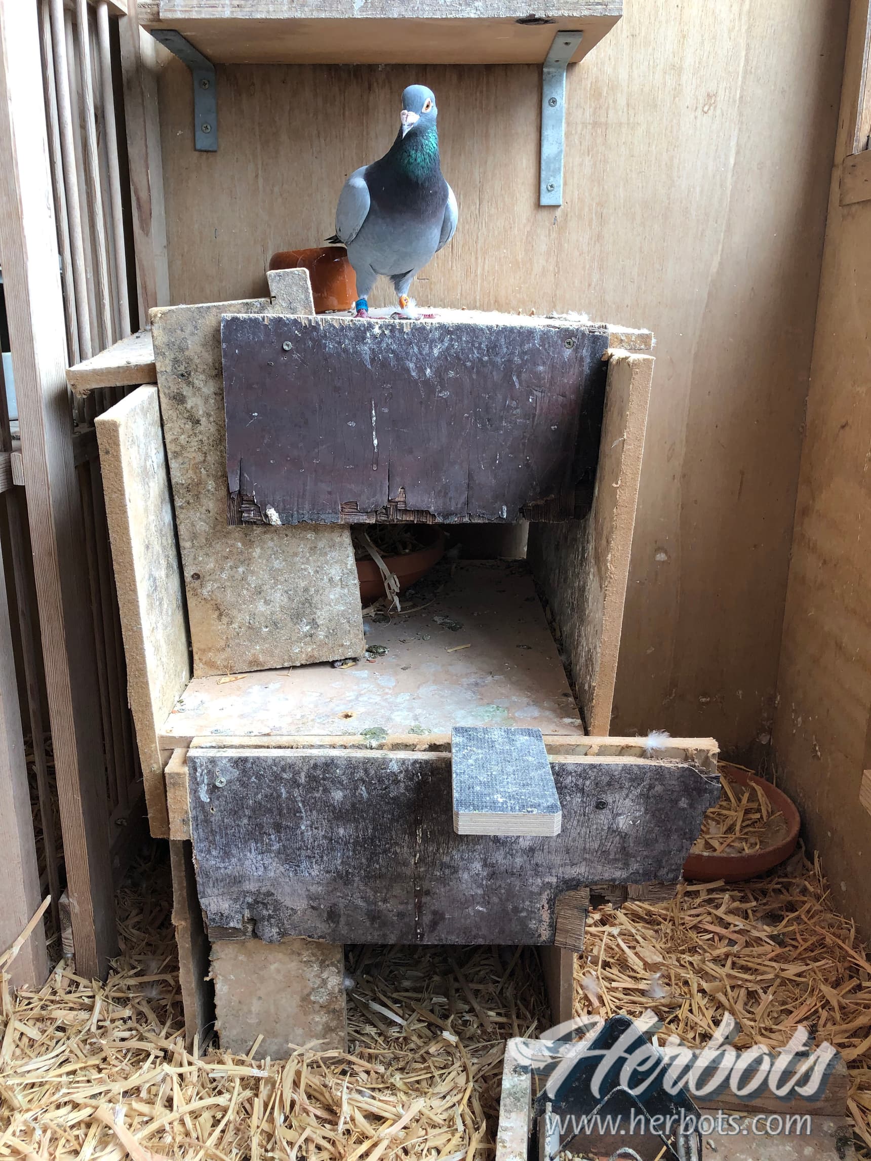 We moved ‘Jef’ past Winter to another loft, we took the decision to move him to the Barcelona team and here he looked for a new box to make his own. But 4 weeks prior to basketing something had changed, the kids hammered two boxes who were on top of each other and ‘Jef’ made them immediately his own. Territory and motivation was top and they started to build a nest into it and was basketed while breeding.