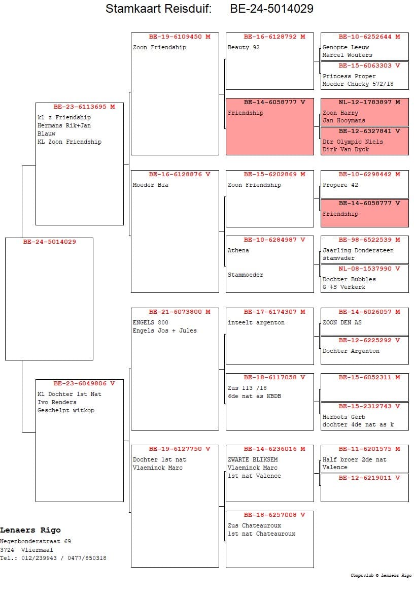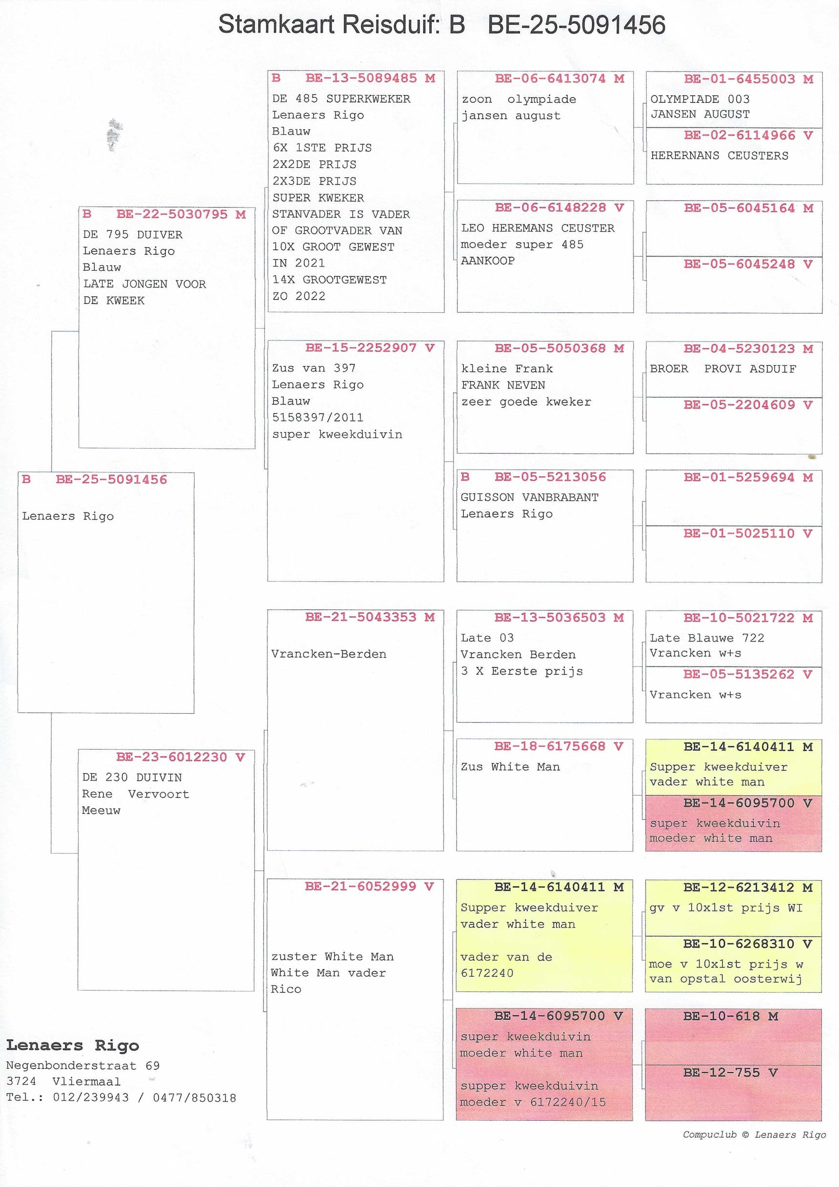 Son of "485/13" Super Breeder 485 and grandson of "Olympiade 003" Leo Heremans x "907/15" Blauw Frank Neven x Guisson Vanbrabant