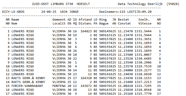This year, Rigo Lenaers from Vliermaal in Limburg is having another fantastic season. Perhaps the best of his career yet. Last weekend, Bourges National was on the agenda, and after several weeks of widowhood, the hens were brought to a nest for the final national races of the season. He not only won 1st Provincial and 1st National Zone, but also 2nd National against 3,990 old and yearlings, along with one of his best racing hens in the loft. A real gem with a fantastic palmares.