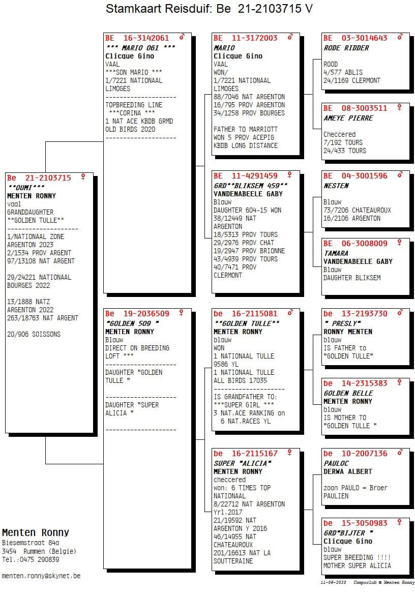 The first national race for Ronny Menten's colony and a direct hit, his 1st signed with the old pigeons was a 2-year old hen who also flew first in Argenton and Bourges last year, but unfortunately was not able to use her qualities enough due to the avian flu to show. Now in 2023 she won a 1st National (z) against 1,373 old birds in a tough race from Argenton. Again this is a granddaughter of the super couple “Golden Tulle” x “Super Alicia” (both top racers from the Ronny Menten household) crossed with the very best of Gino Clicque.