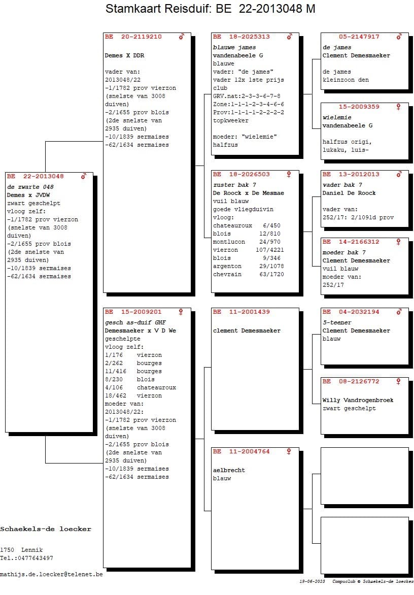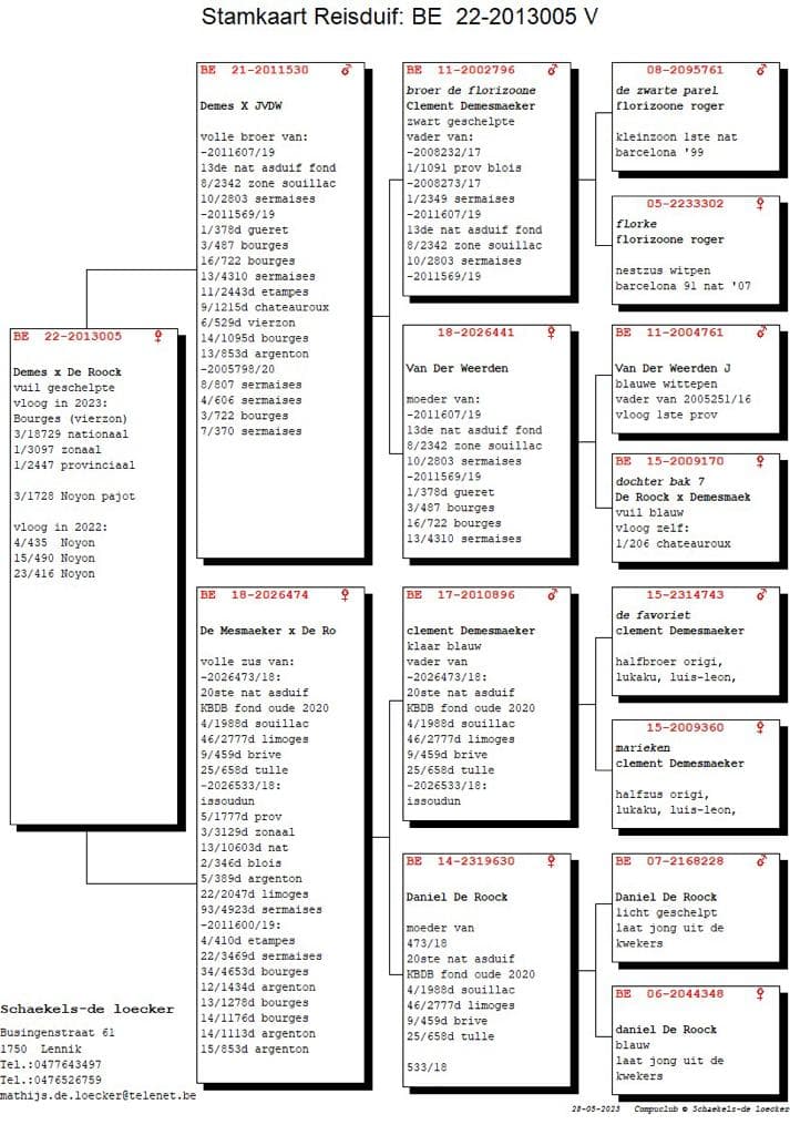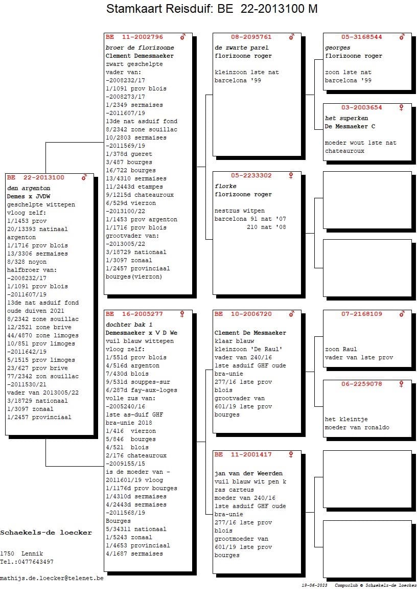Father from “607/19” 13 Nat Ace long distance old birds KBDB 2021 with a.o. 8 Nat (z) Souillac 2.342p – 10 Prov Limoges 851p – 12 Nat (z) Brive 2.521p – 14 Sermaises 4.923p – 44 Nat (z) Limoges 4.870p